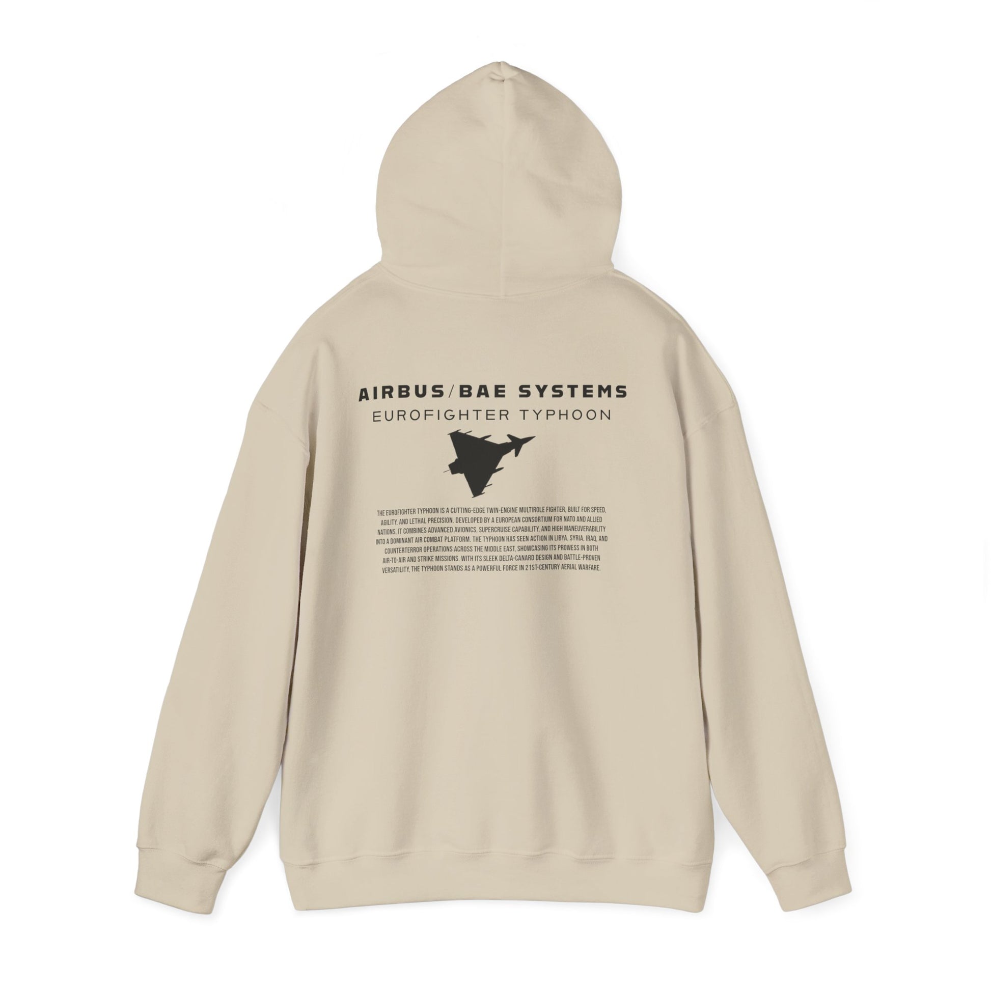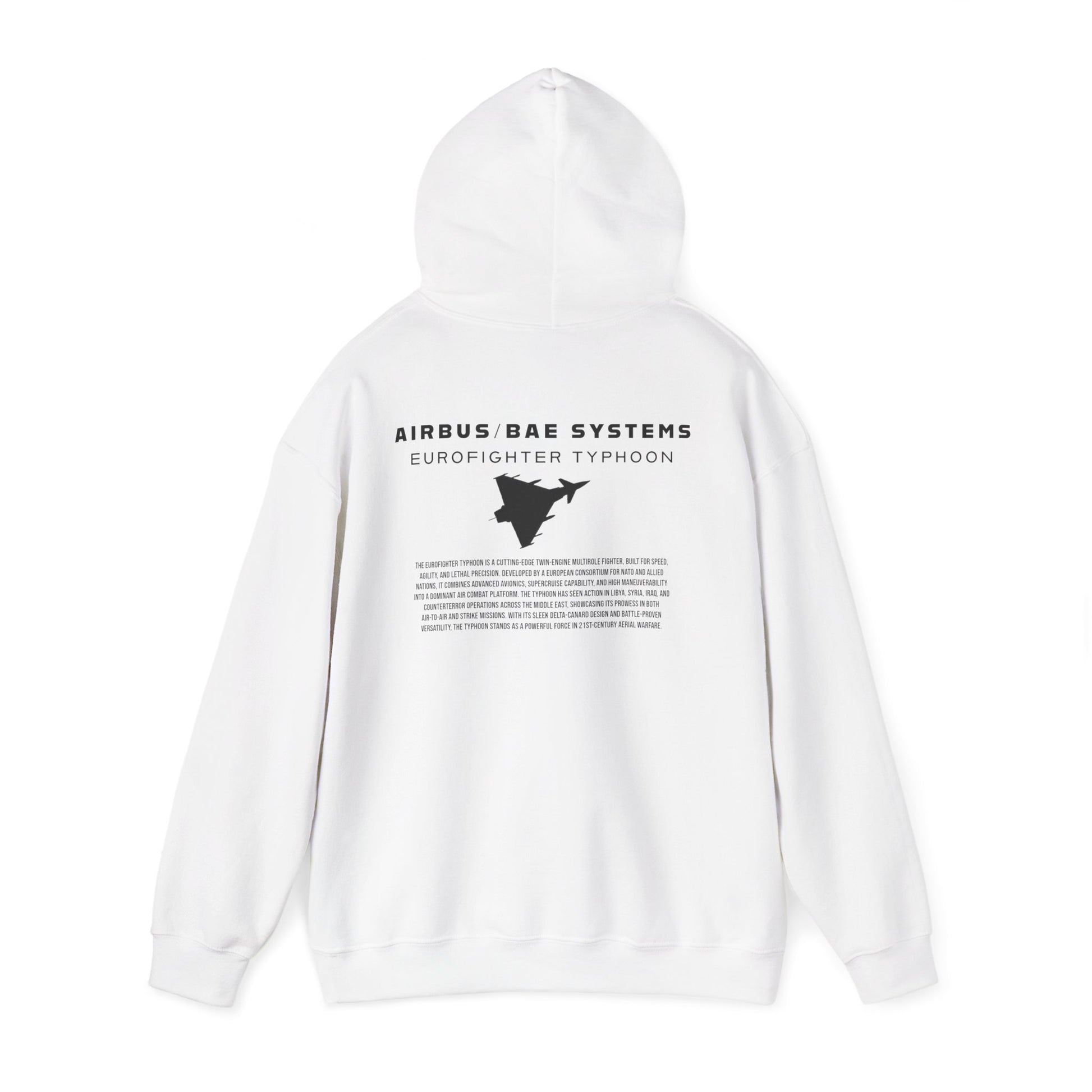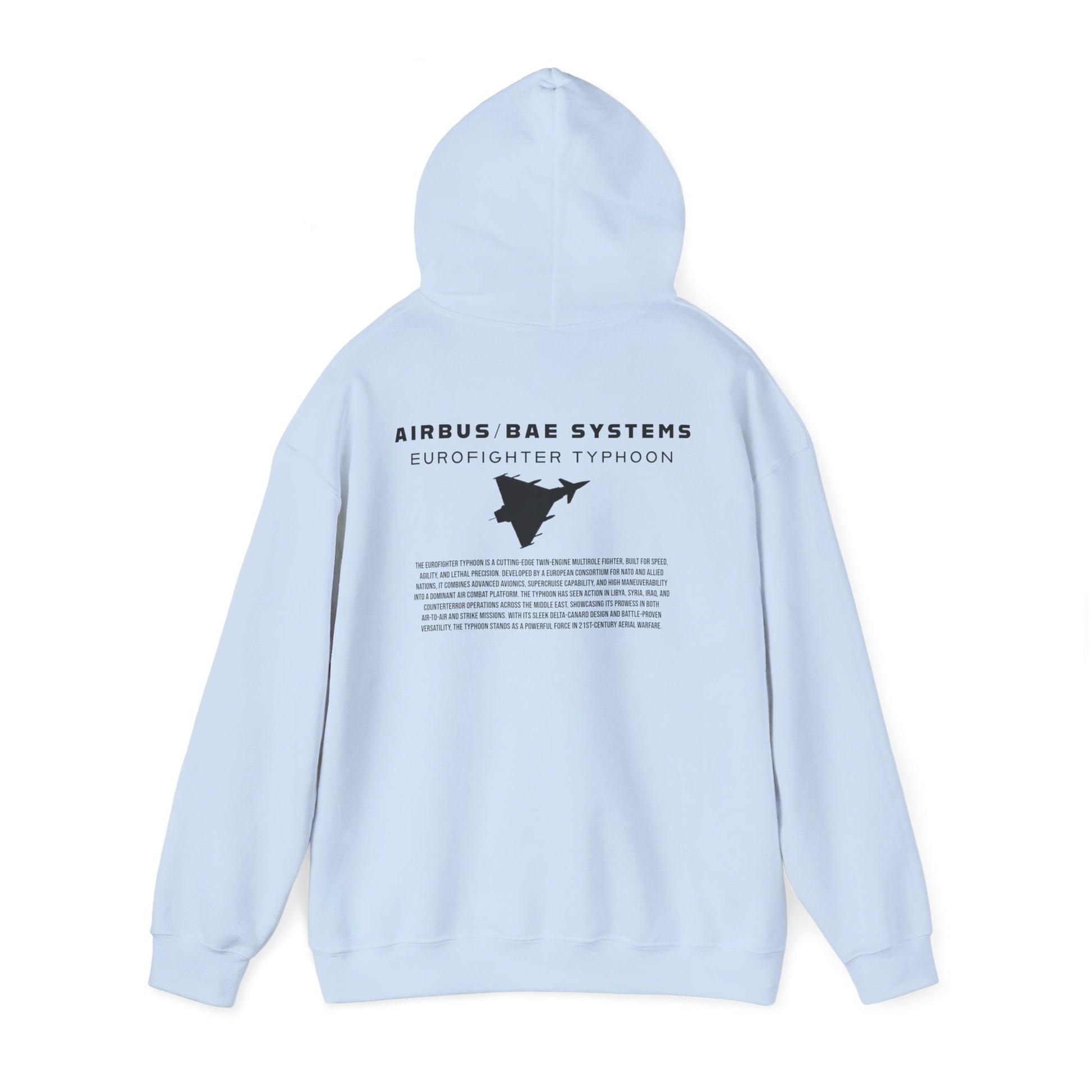 Una hermosa y elegante sudadera con capucha que presenta la silueta de un avión Typhoon, el logotipo del Comando Aéreo Aliado de la OTAN en el frente y una breve descripción de uno de los mejores aviones de Europa.
