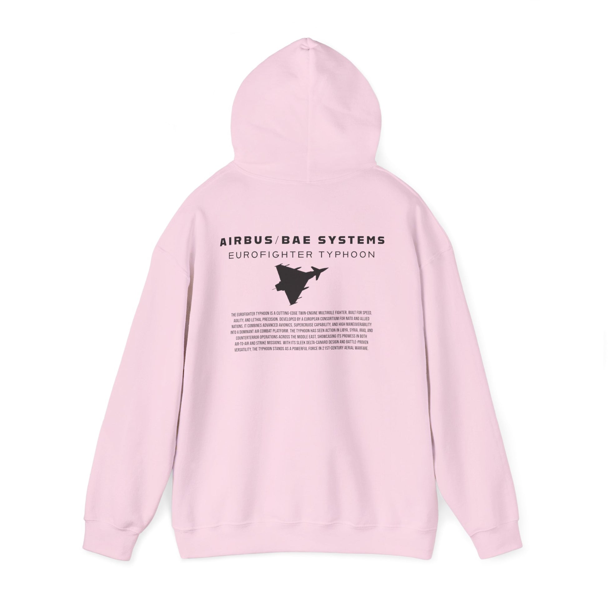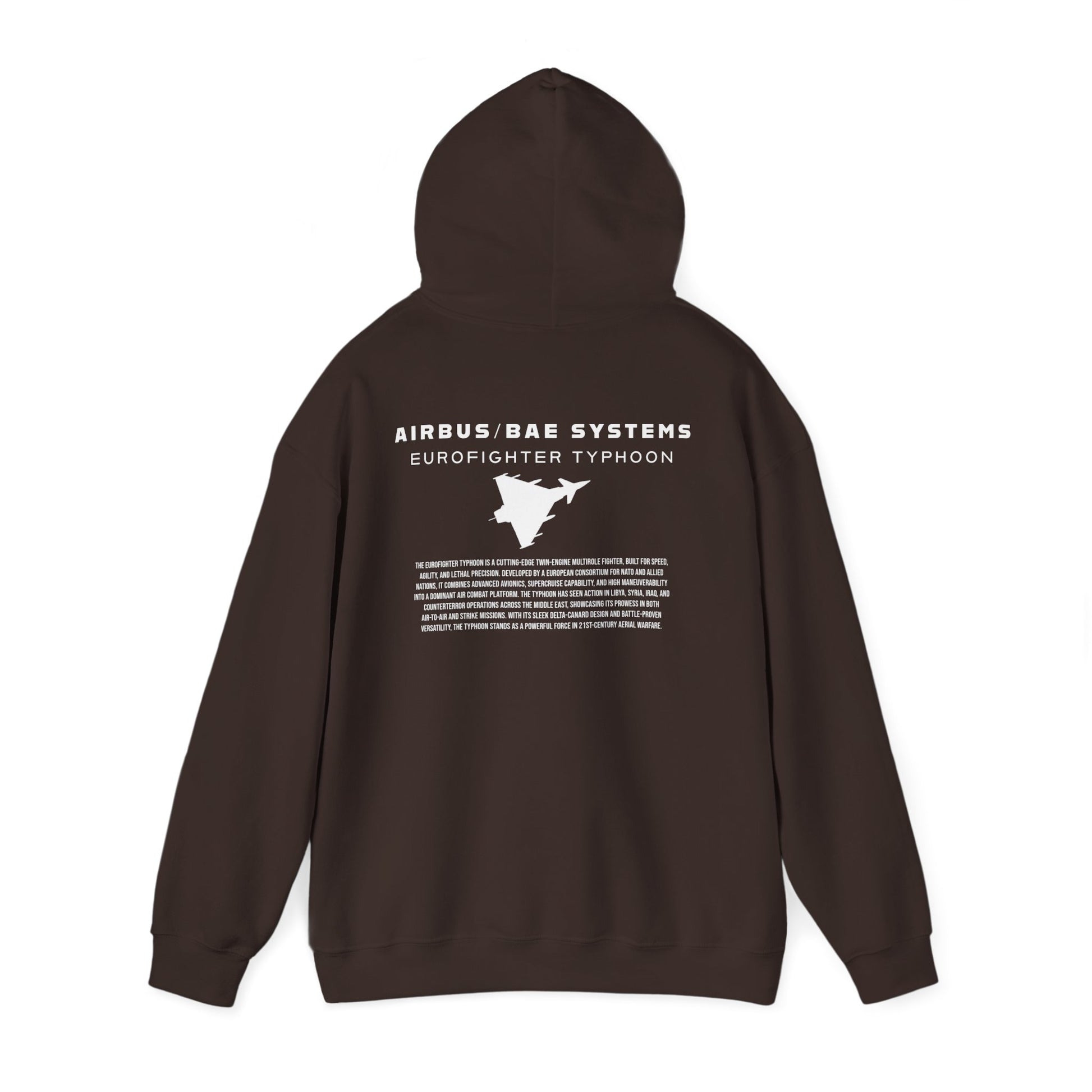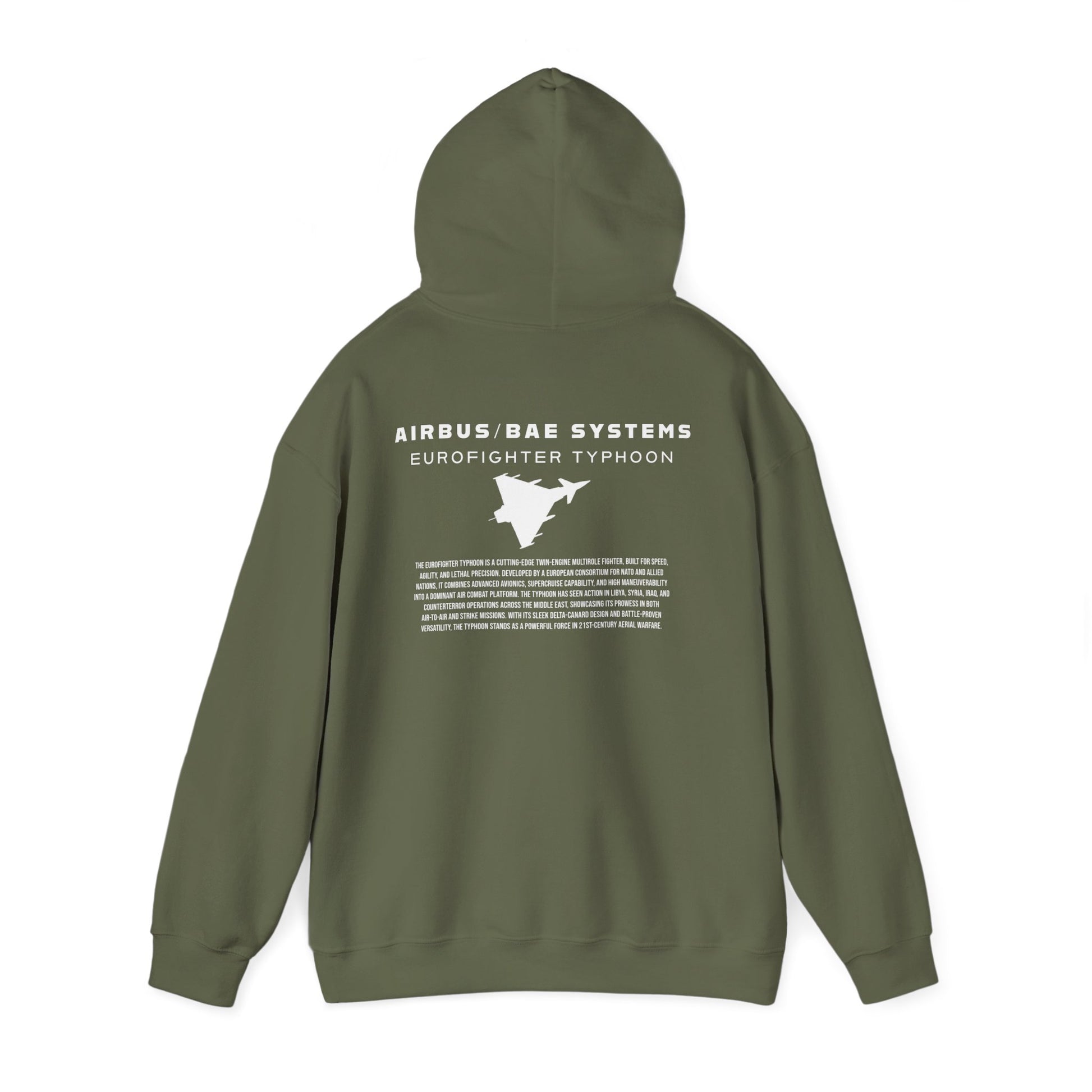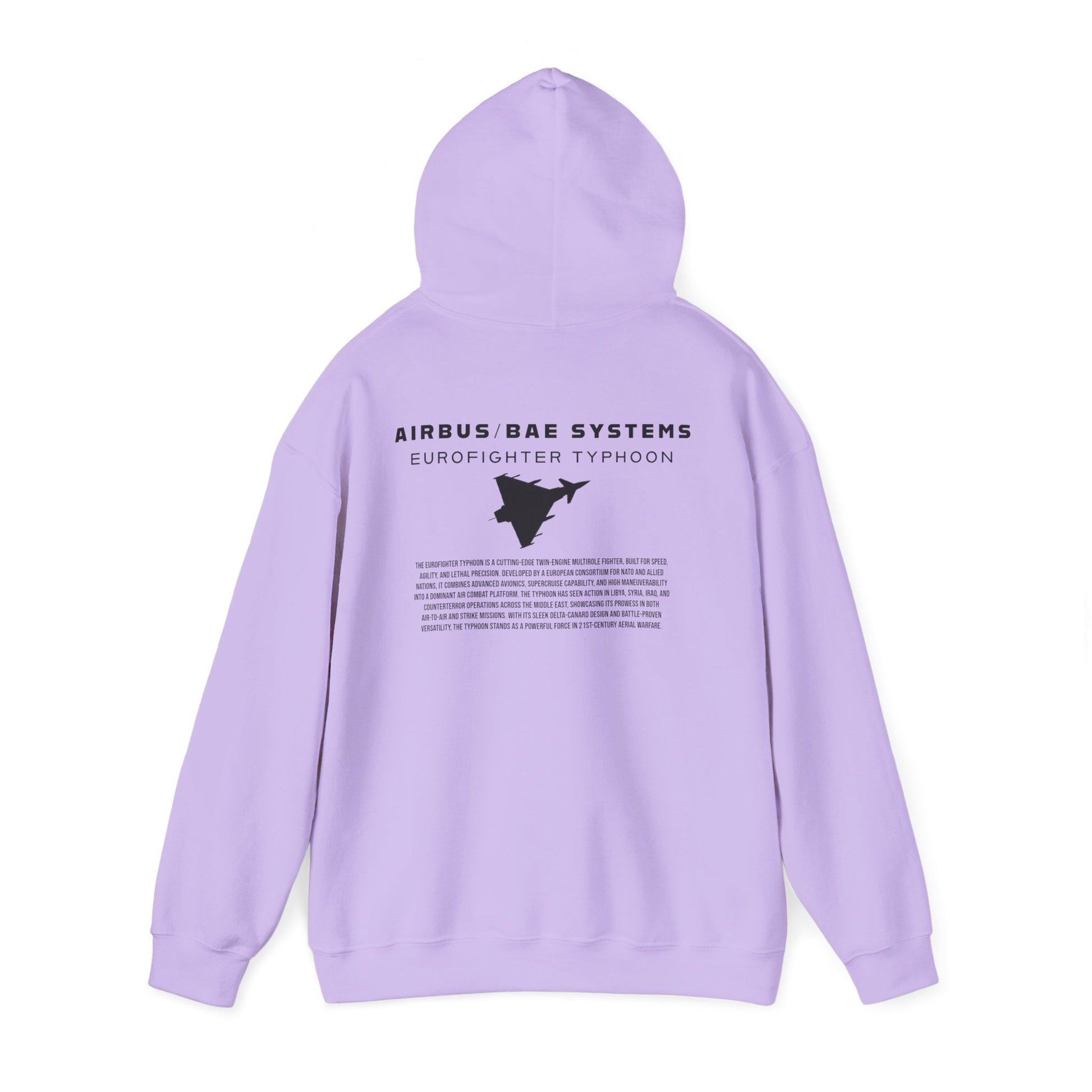 Una hermosa y elegante sudadera con capucha que presenta la silueta de un avión Typhoon, el logotipo del Comando Aéreo Aliado de la OTAN en el frente y una breve descripción de uno de los mejores aviones de Europa.