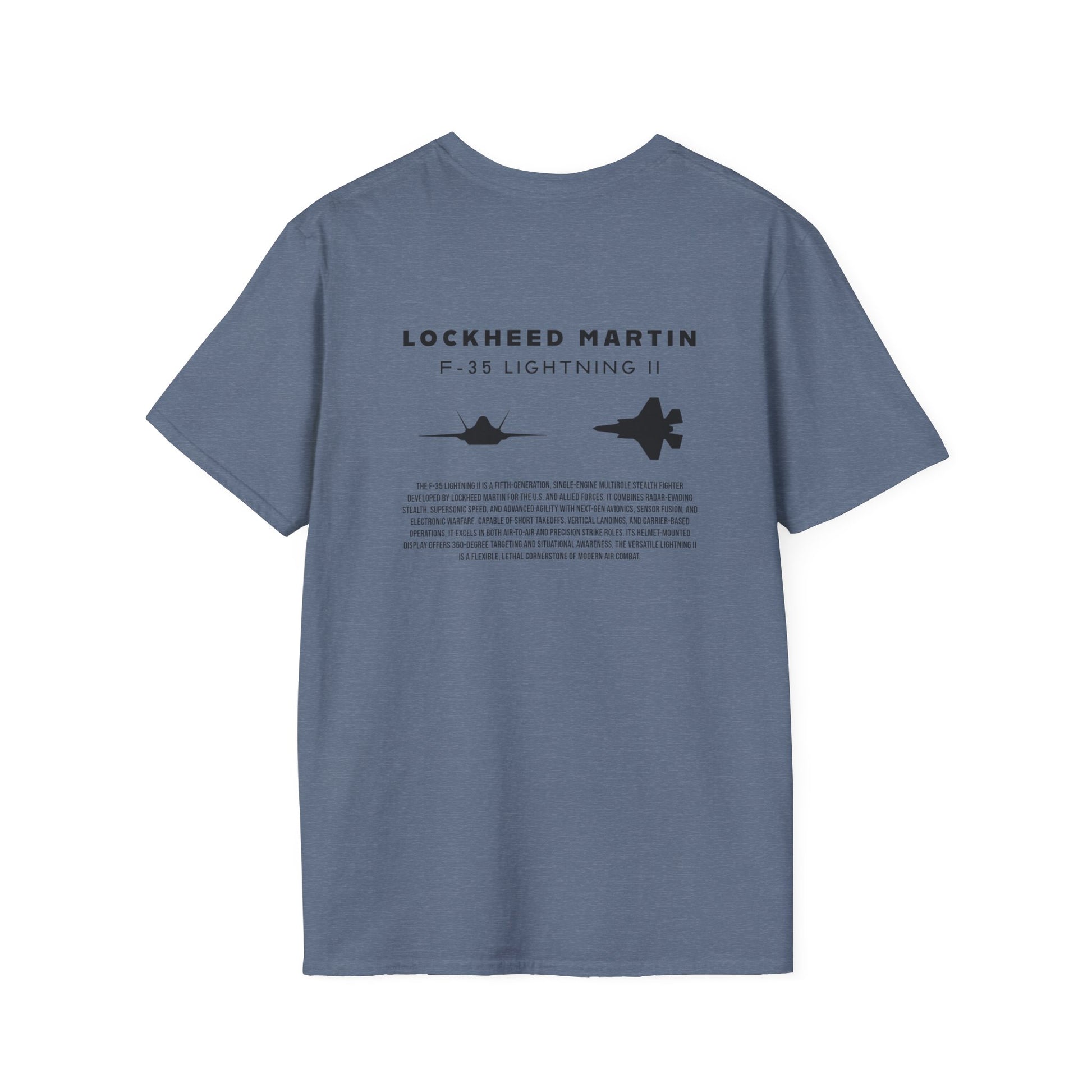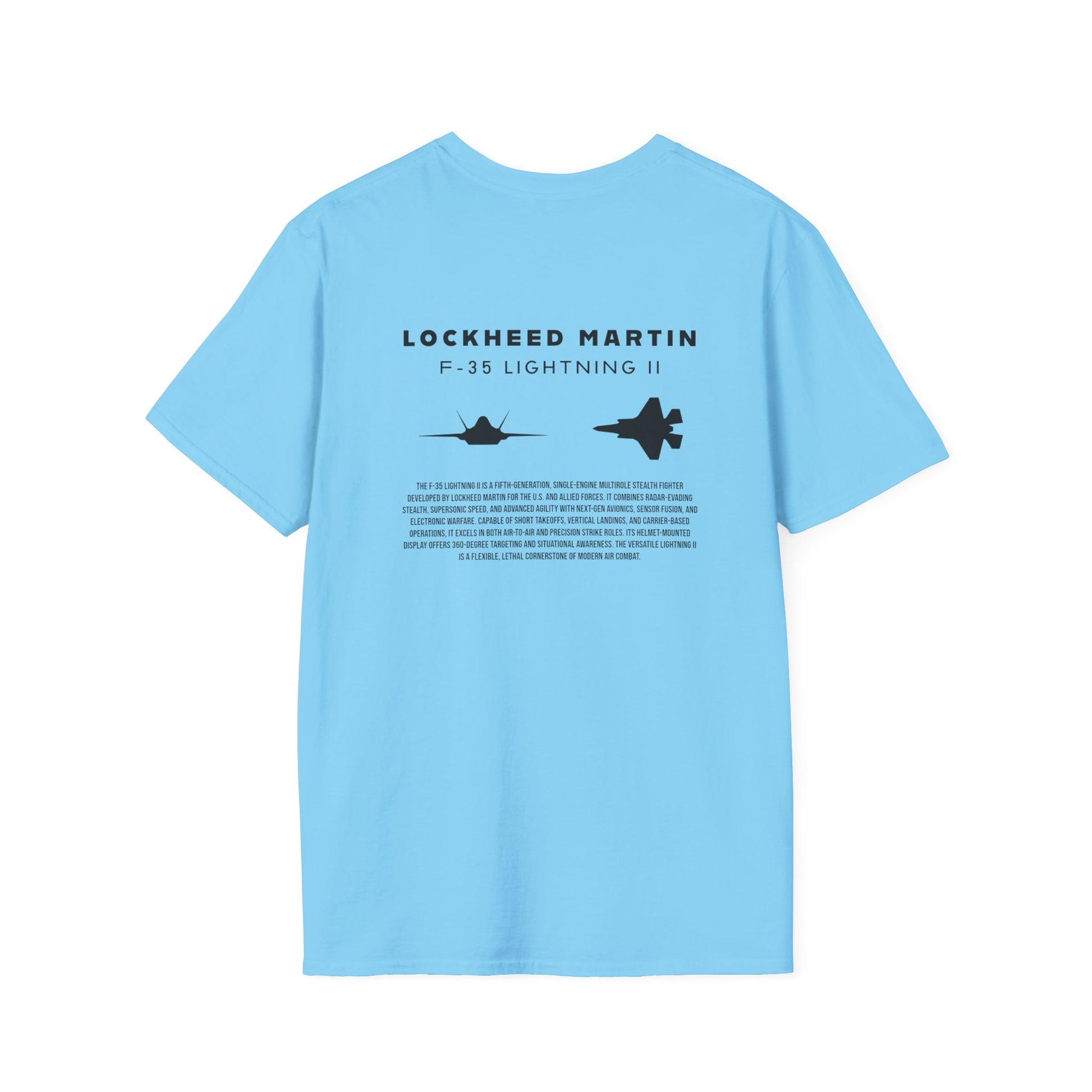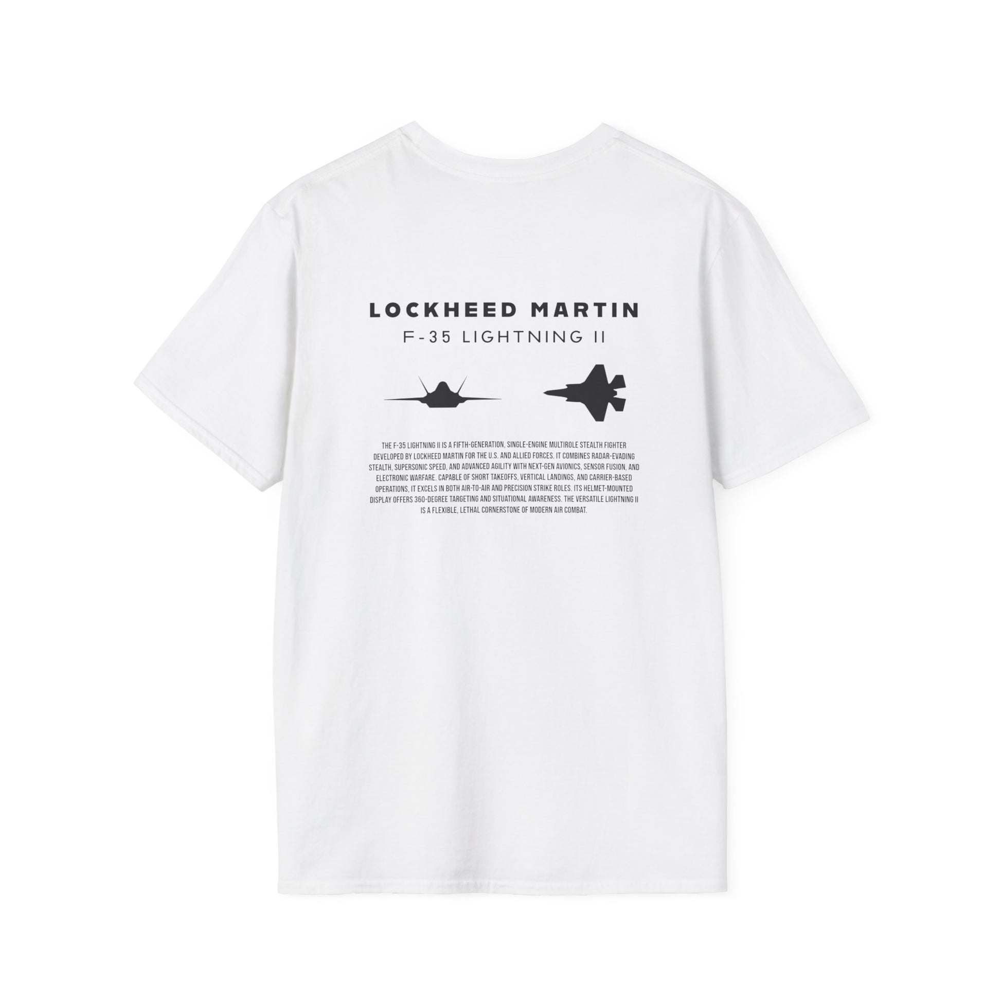A beautiful and stylish t-shirt featuring a F-35 Lightning II jet silhouette, the tail logo of a Hawaiian F-35 in the front, and a brief description of the most technologically advanced fighter jet of all time.