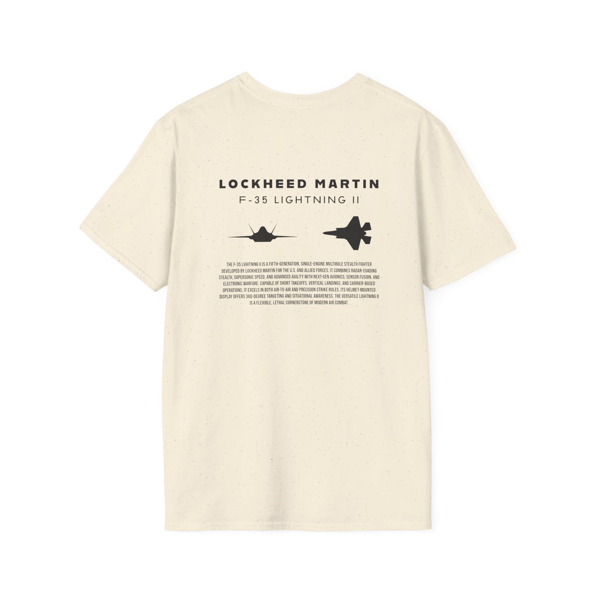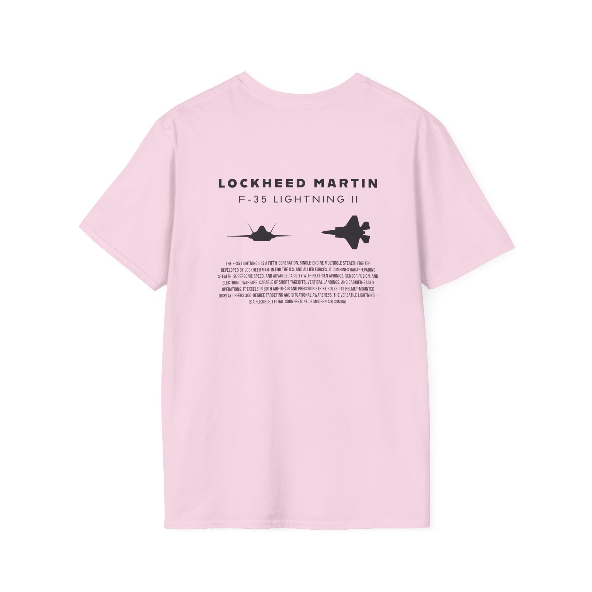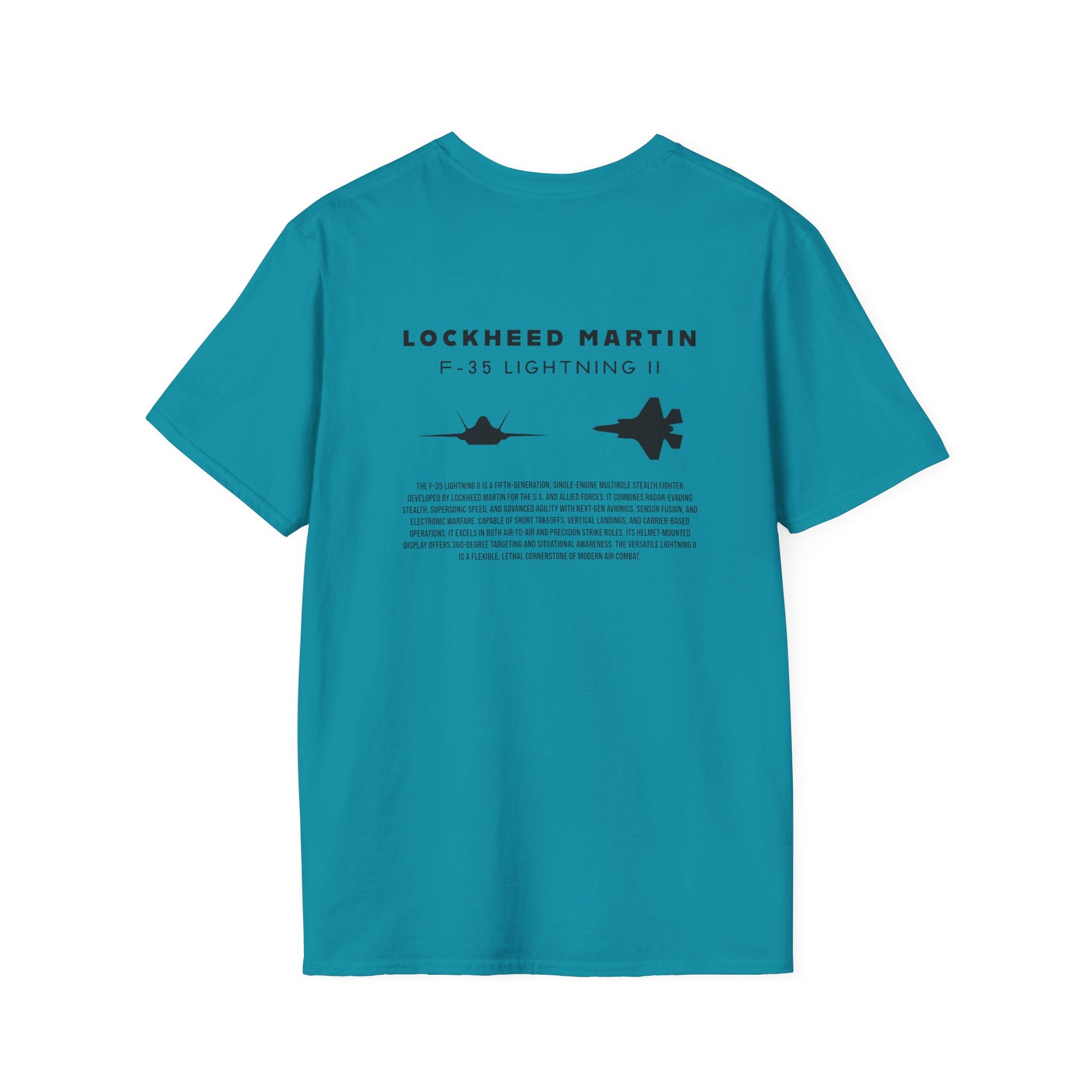 A beautiful and stylish t-shirt featuring a F-35 Lightning II jet silhouette, the tail logo of a Hawaiian F-35 in the front, and a brief description of the most technologically advanced fighter jet of all time.