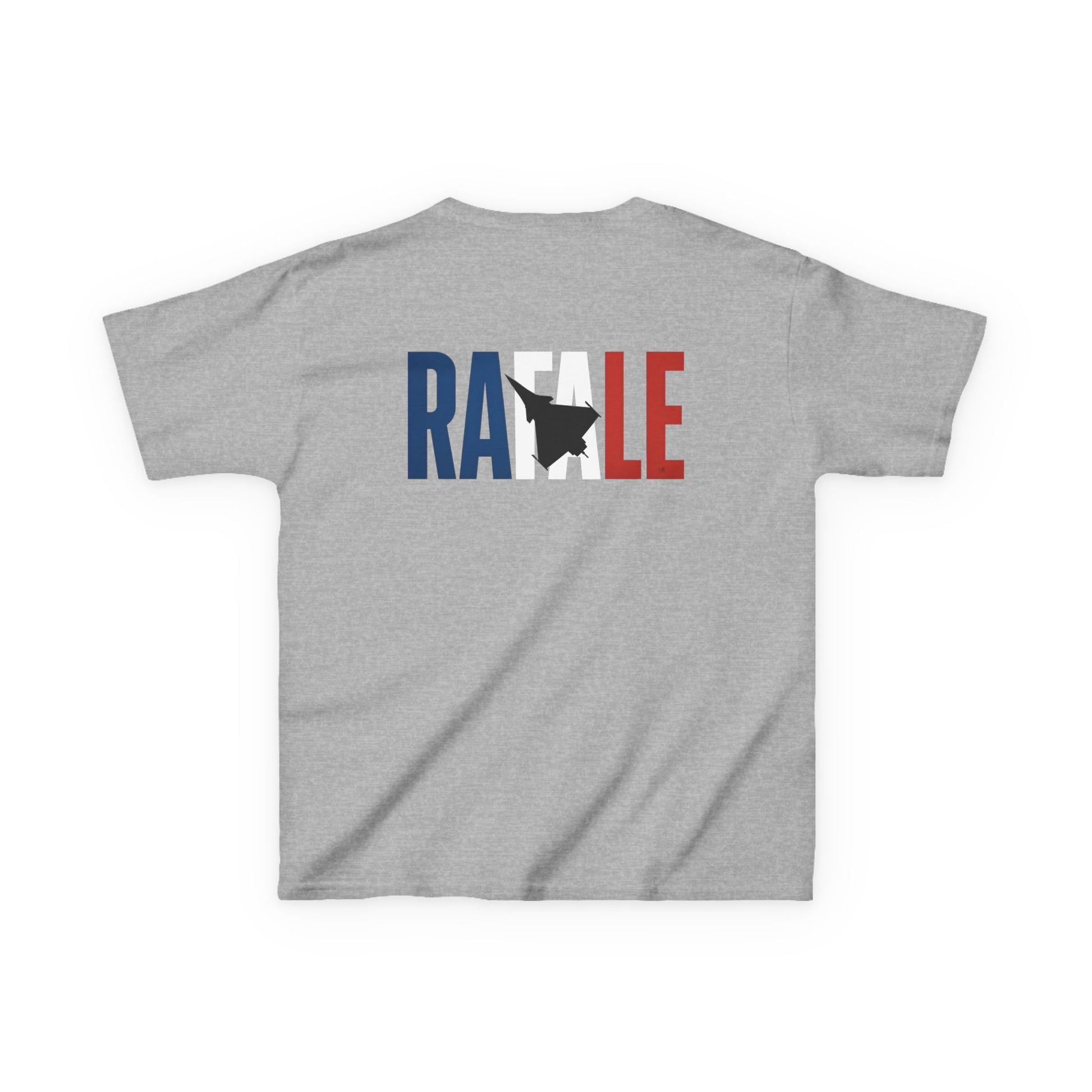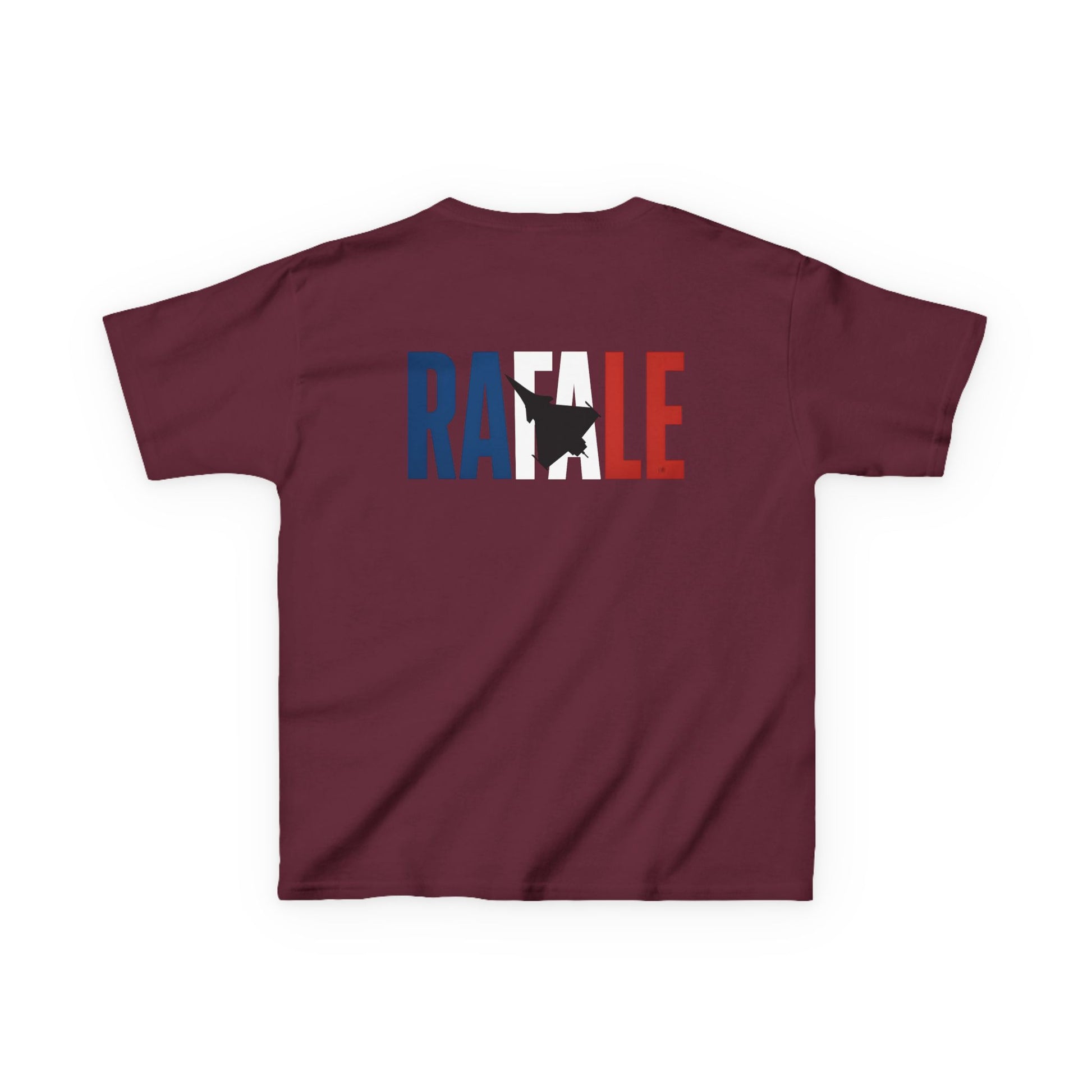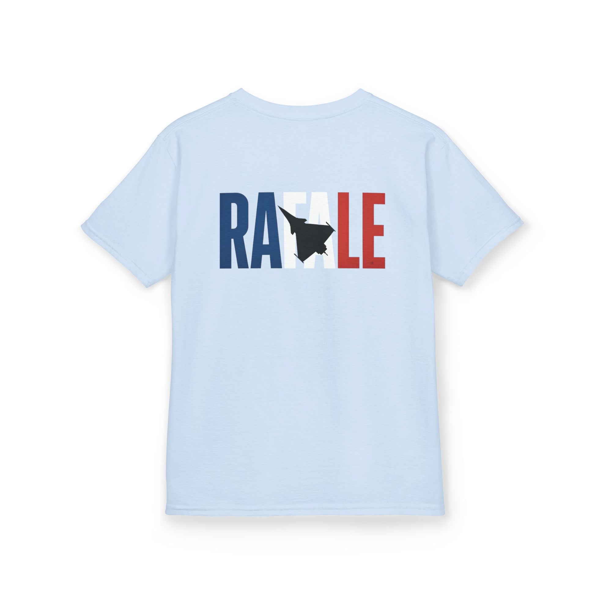 Un diseño elegante, moderno y minimalista pensado para los más pequeños, que presenta un avión de combate Dassault Rafale superpuesto con la palabra "Rafale", coloreada con la bandera de Francia.
