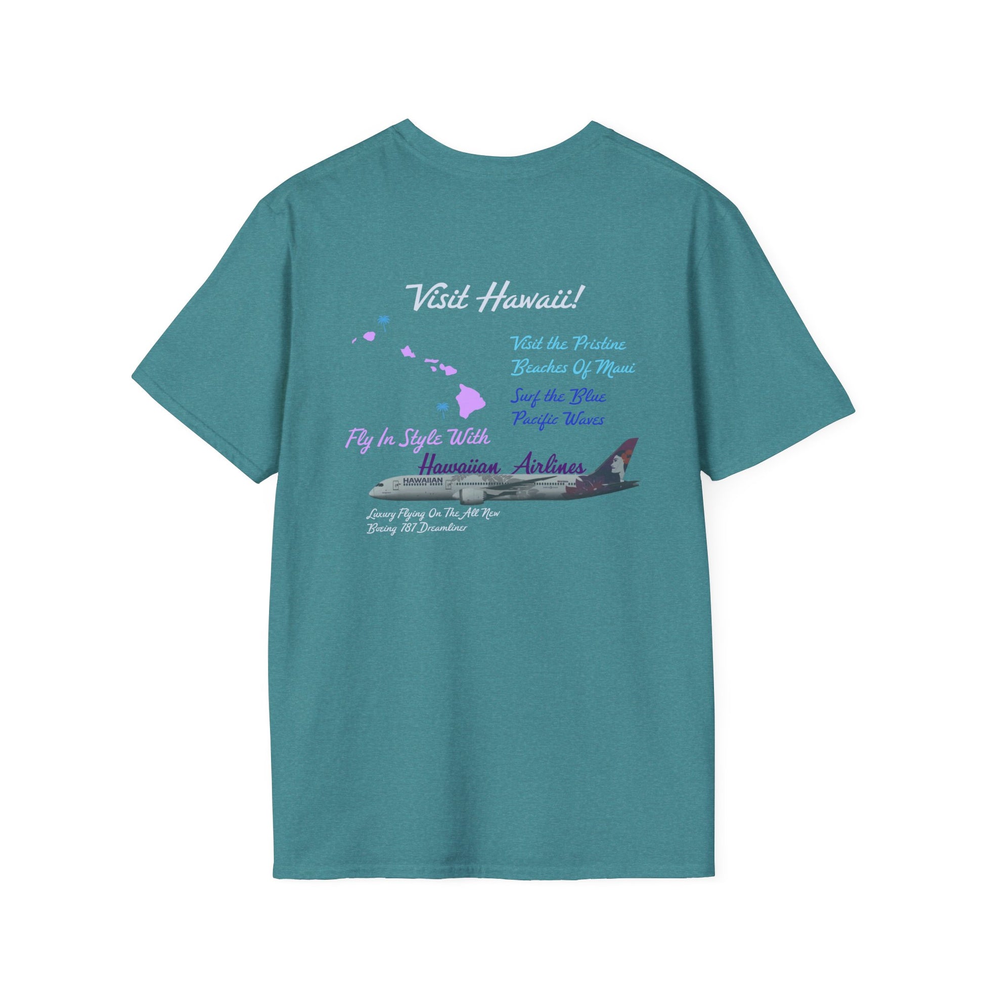 This stylish TravelWear t-shirt replicates retro style airline adverts for Hawaii! Featuring a map of the islands and a luxury look advertising the Hawaiian 787, this t-shirt is one of our best!
