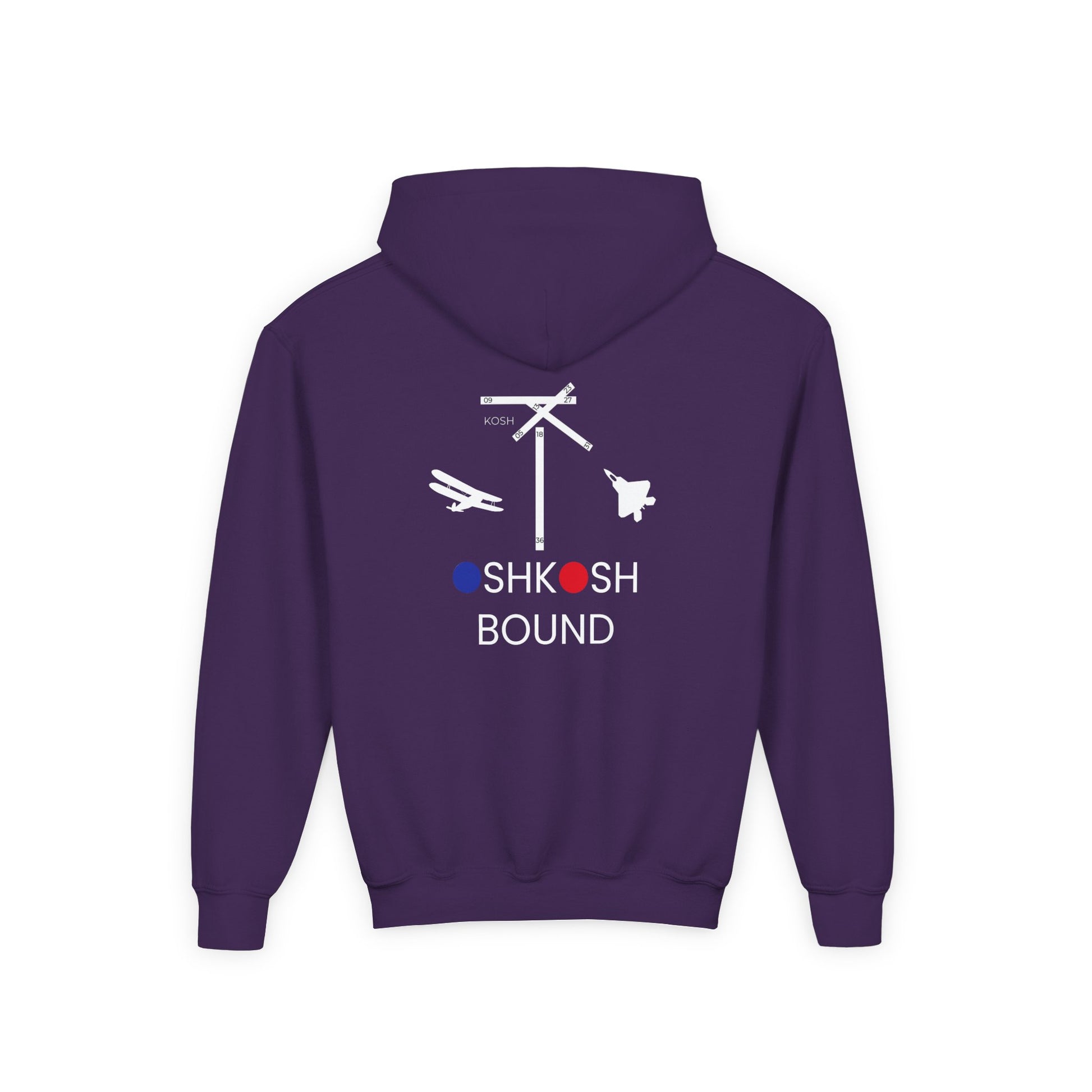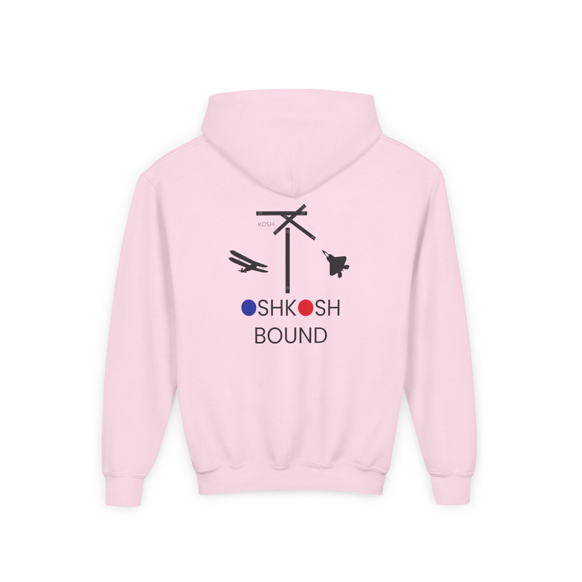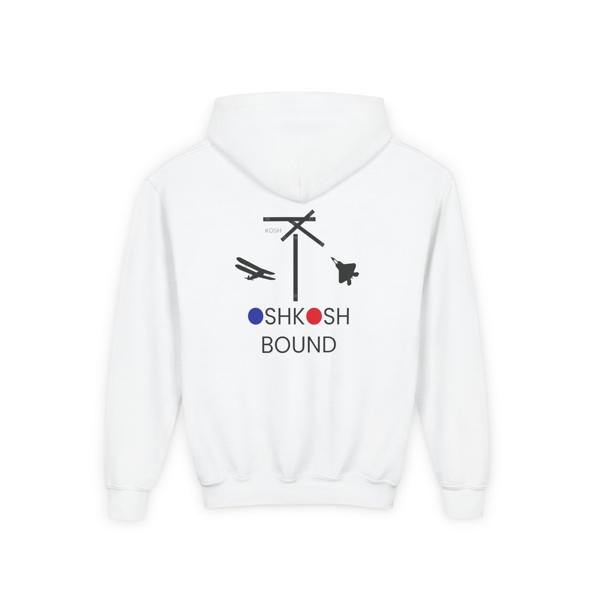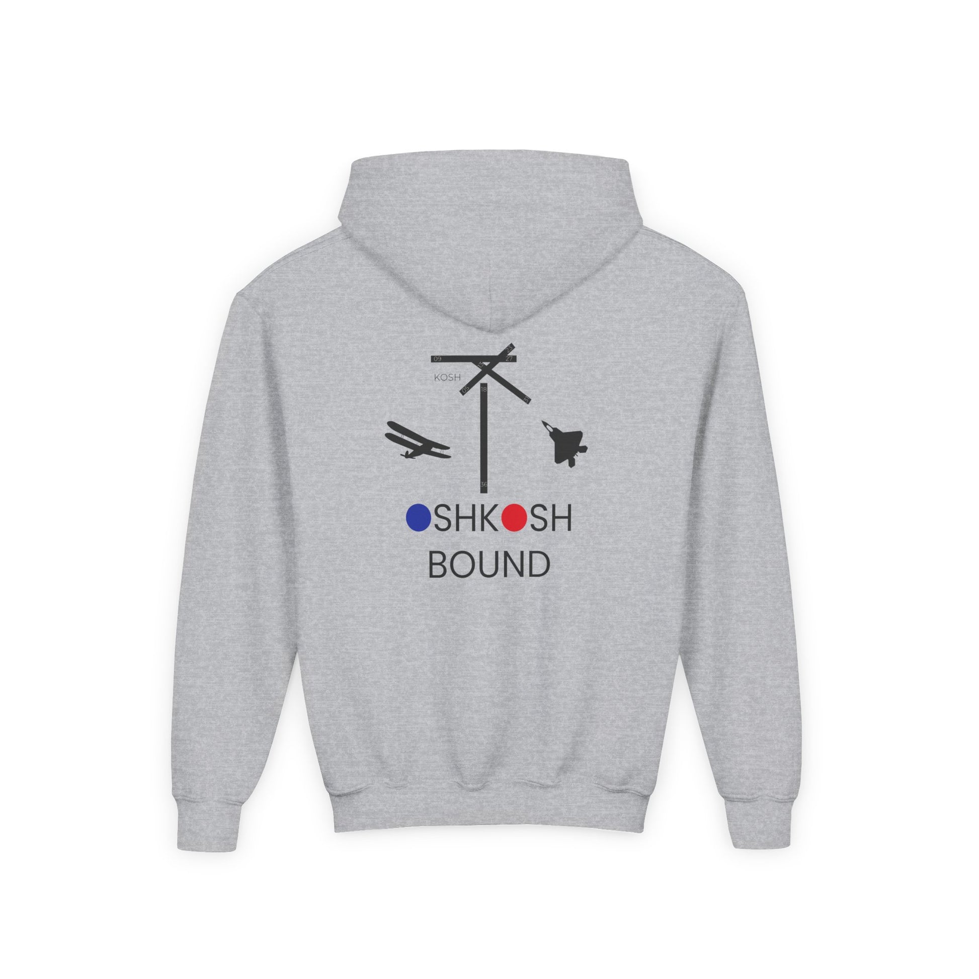 Going to Oshkosh this year? Show your love for the world's biggest airshow with this awesome hoodie in youth sizing! Featuring Oshkosh Airport vector art and "Oshkosh Bound" text, this hoodie is sure to draw some eyes!