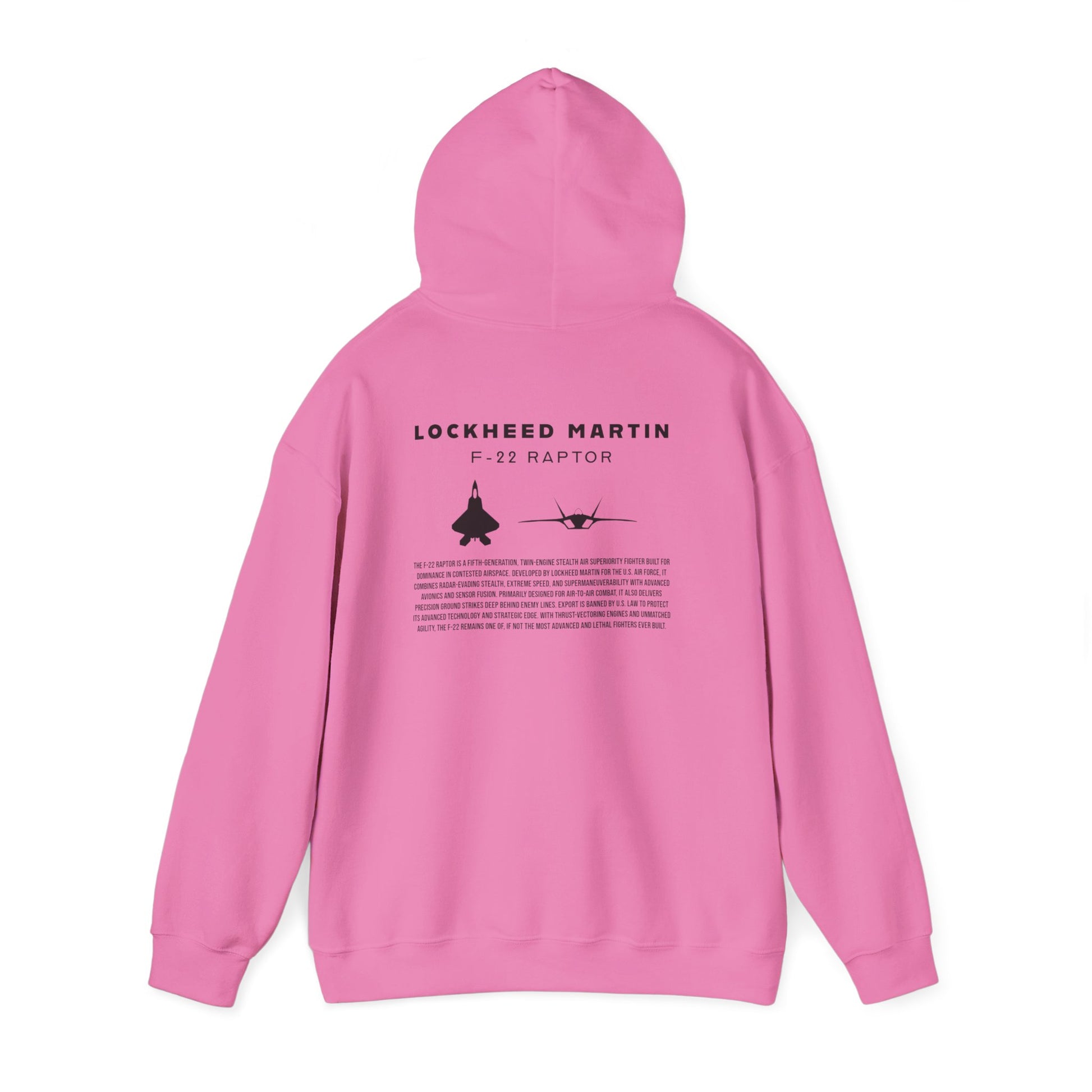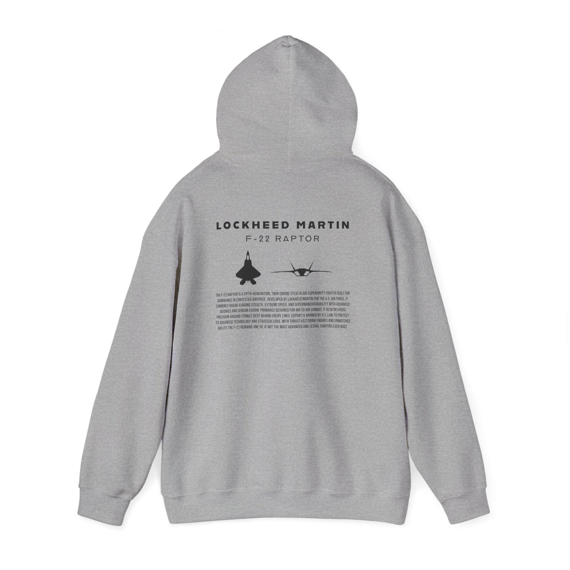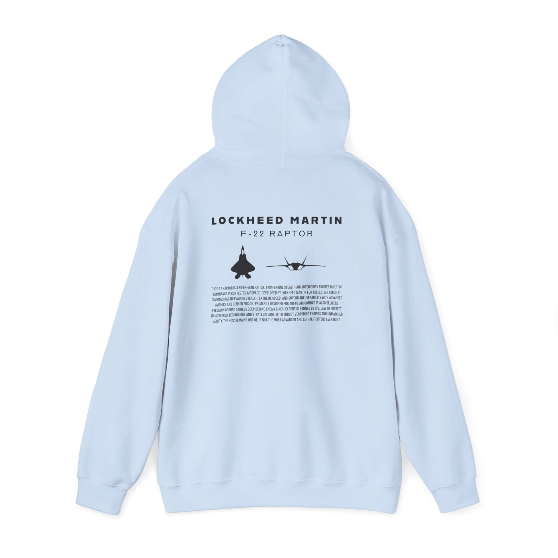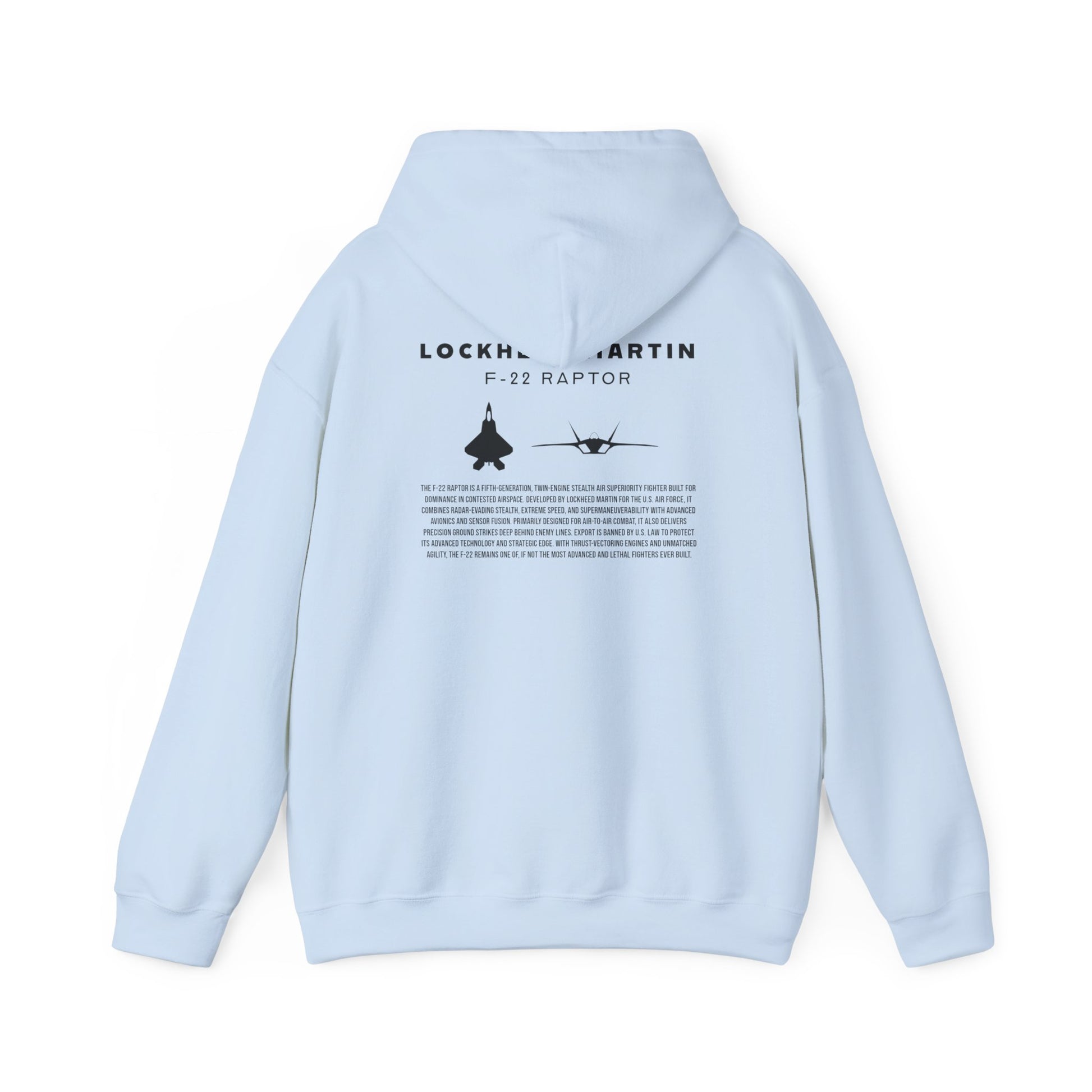A beautiful and stylish hoodie featuring a F-22 Raptor jet silhouette, the tail logo of an Alaska F-22 in the front, and a brief description of one of what is considered to be the greatest fighter jet of all time.