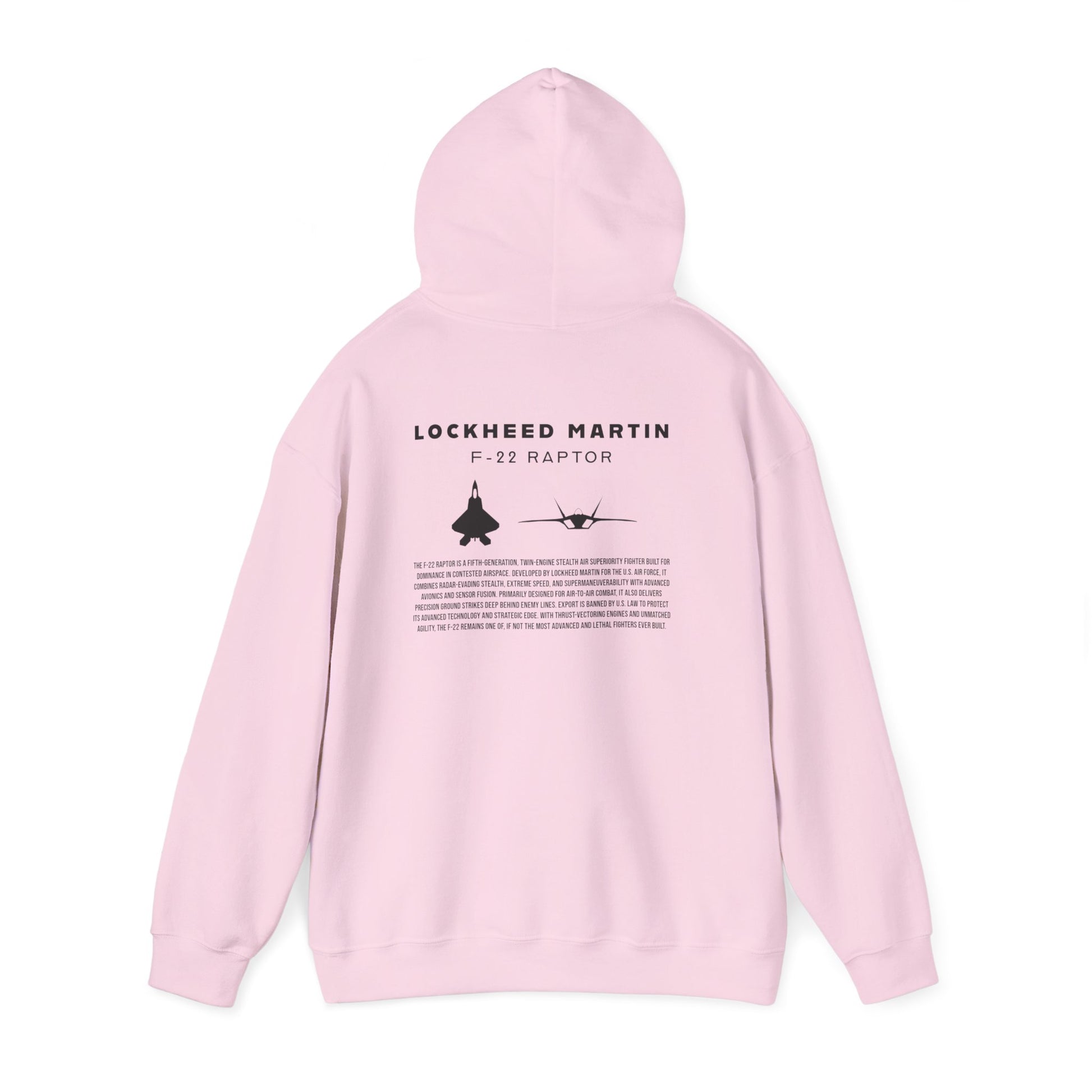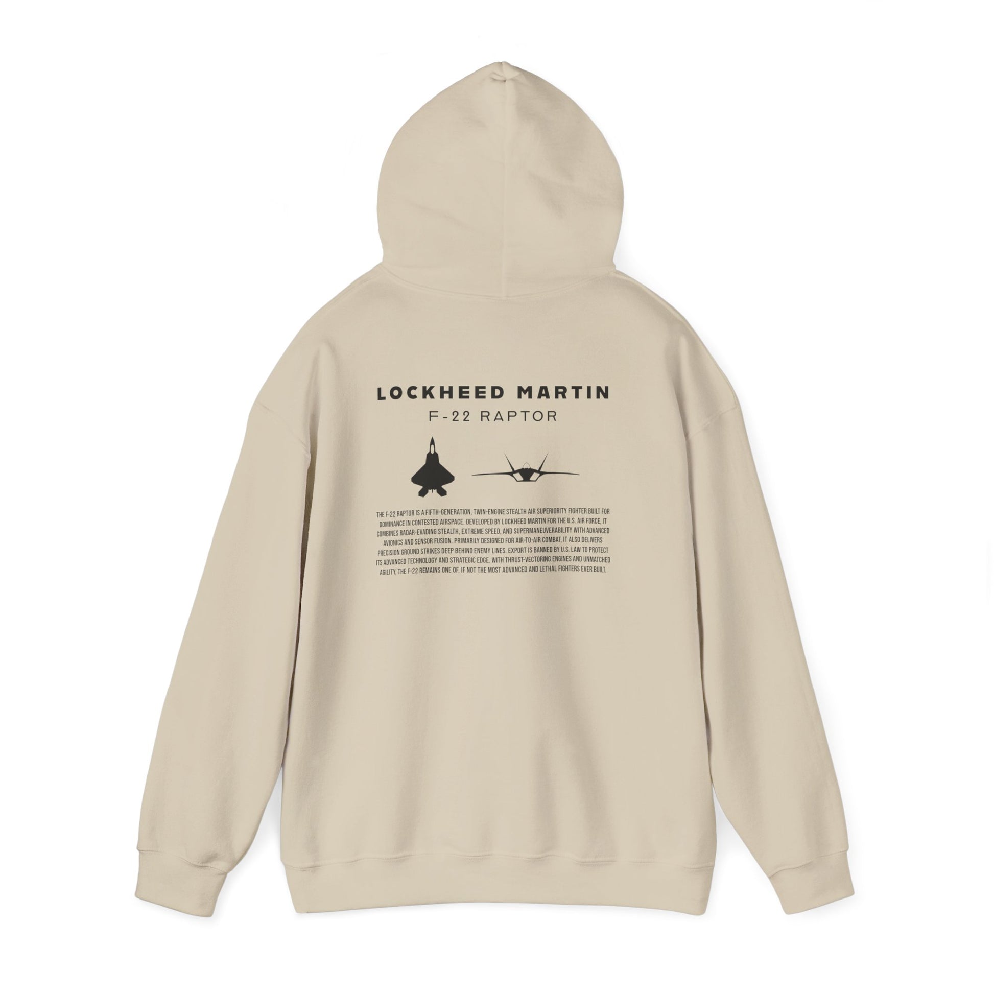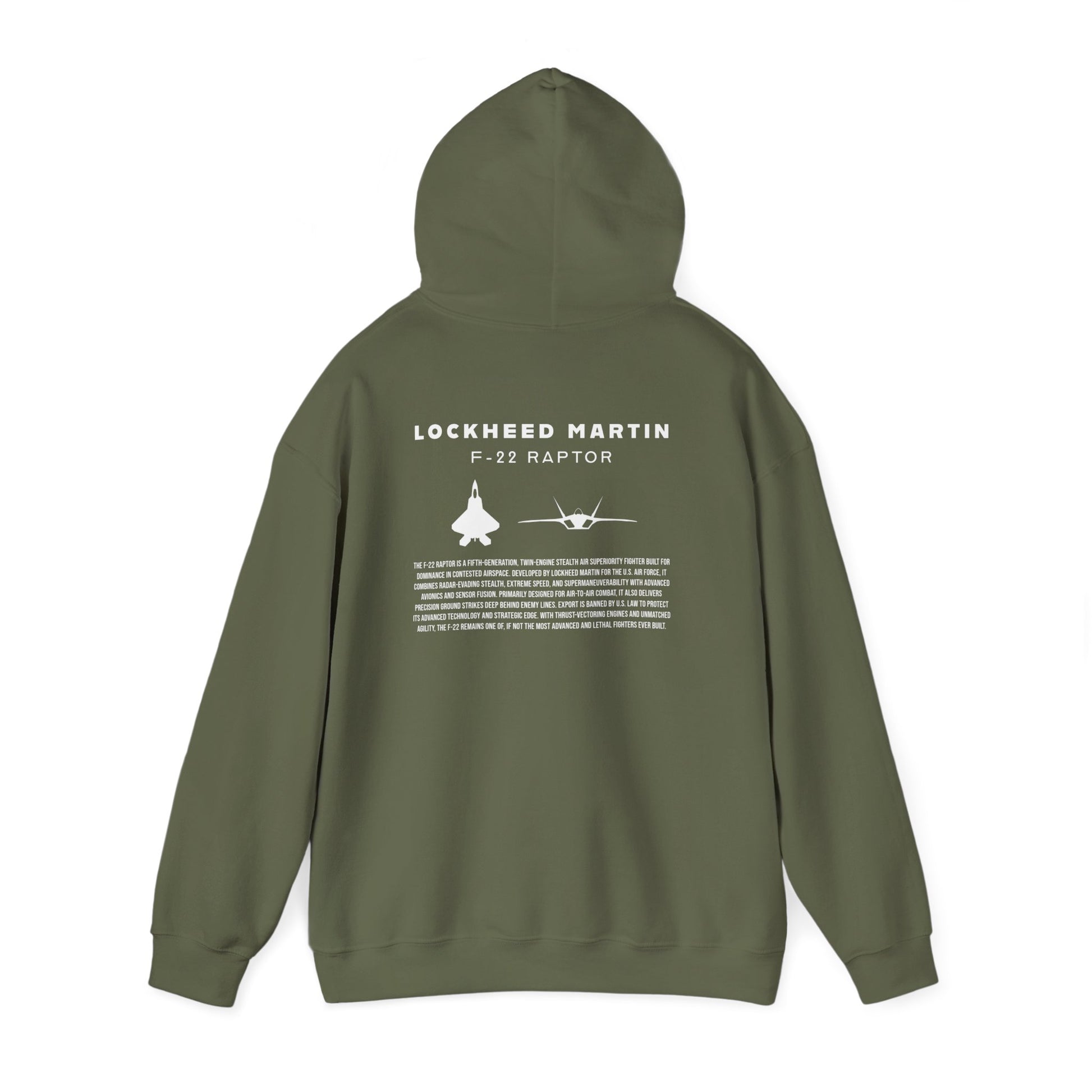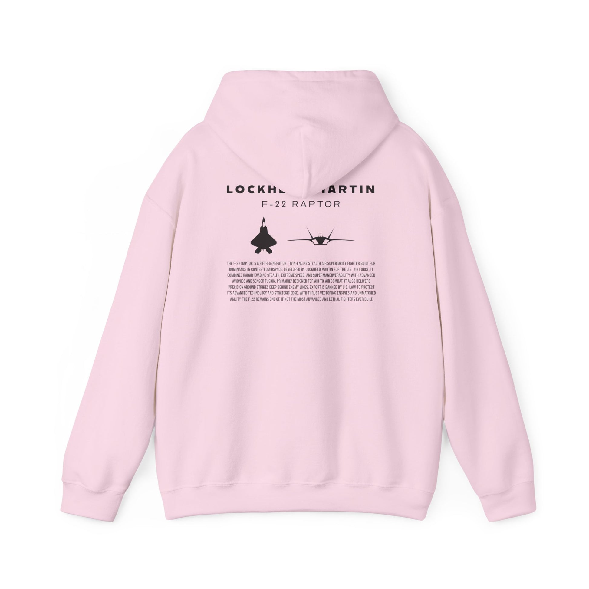 A beautiful and stylish hoodie featuring a F-22 Raptor jet silhouette, the tail logo of an Alaska F-22 in the front, and a brief description of one of what is considered to be the greatest fighter jet of all time.