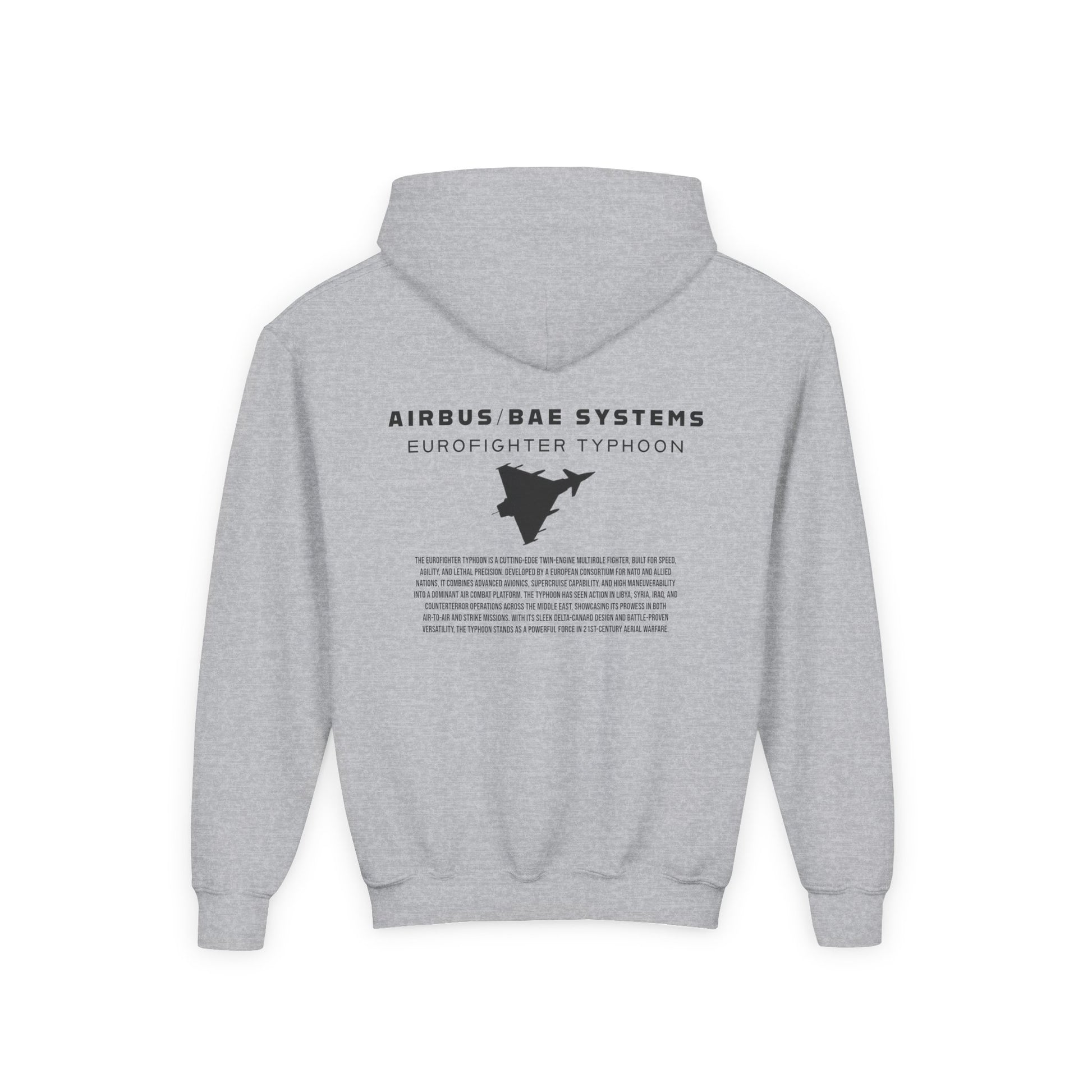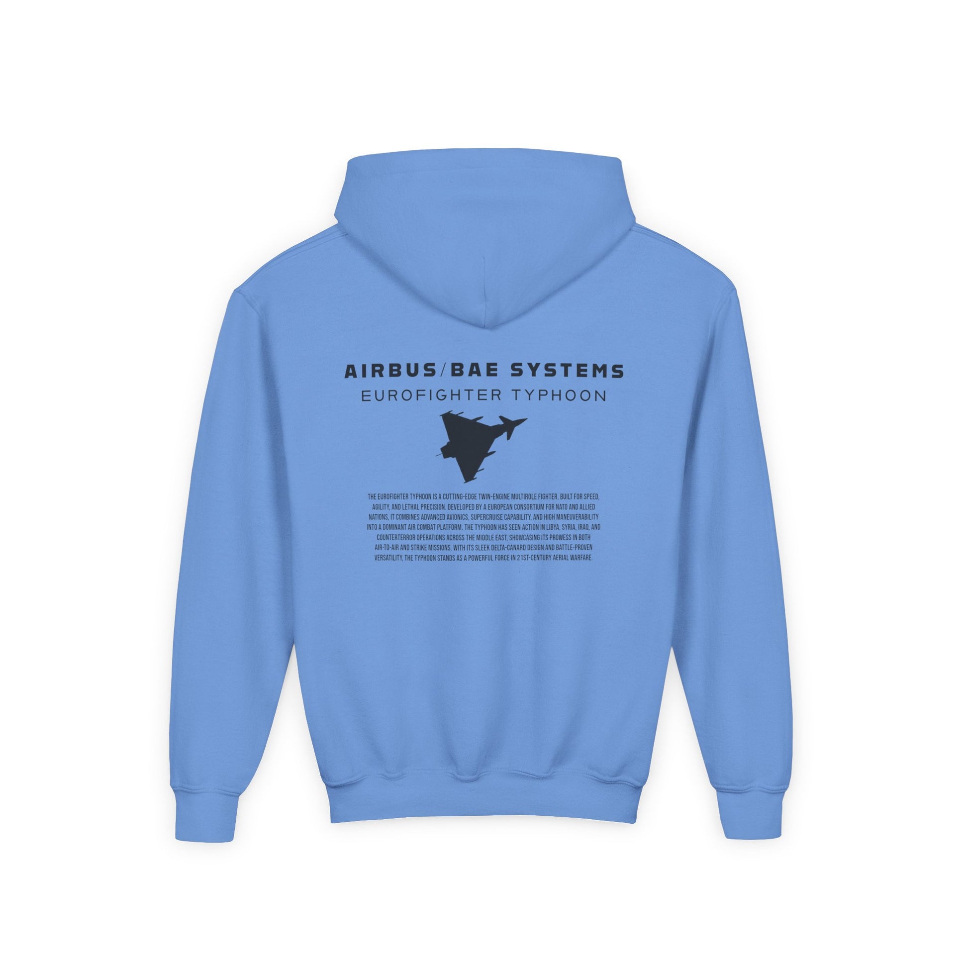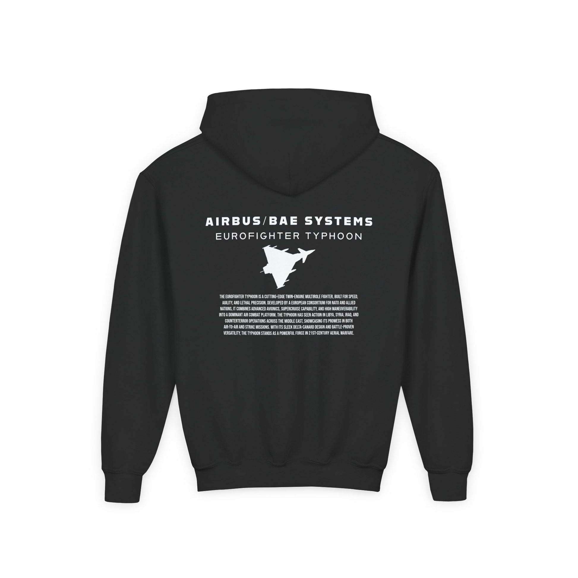 A beautiful and stylish hoodie in youth sizing featuring a Typhoon jet silhouette in the back, a Luftwaffe aircraft code artfully crafted in the corner of the front, and a brief description of one of Europe's finest jets.