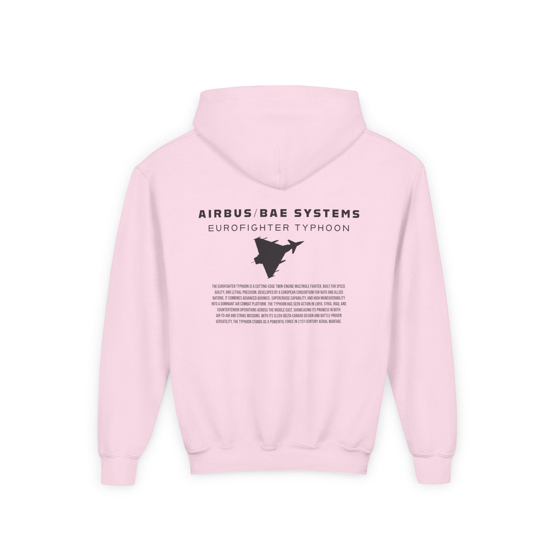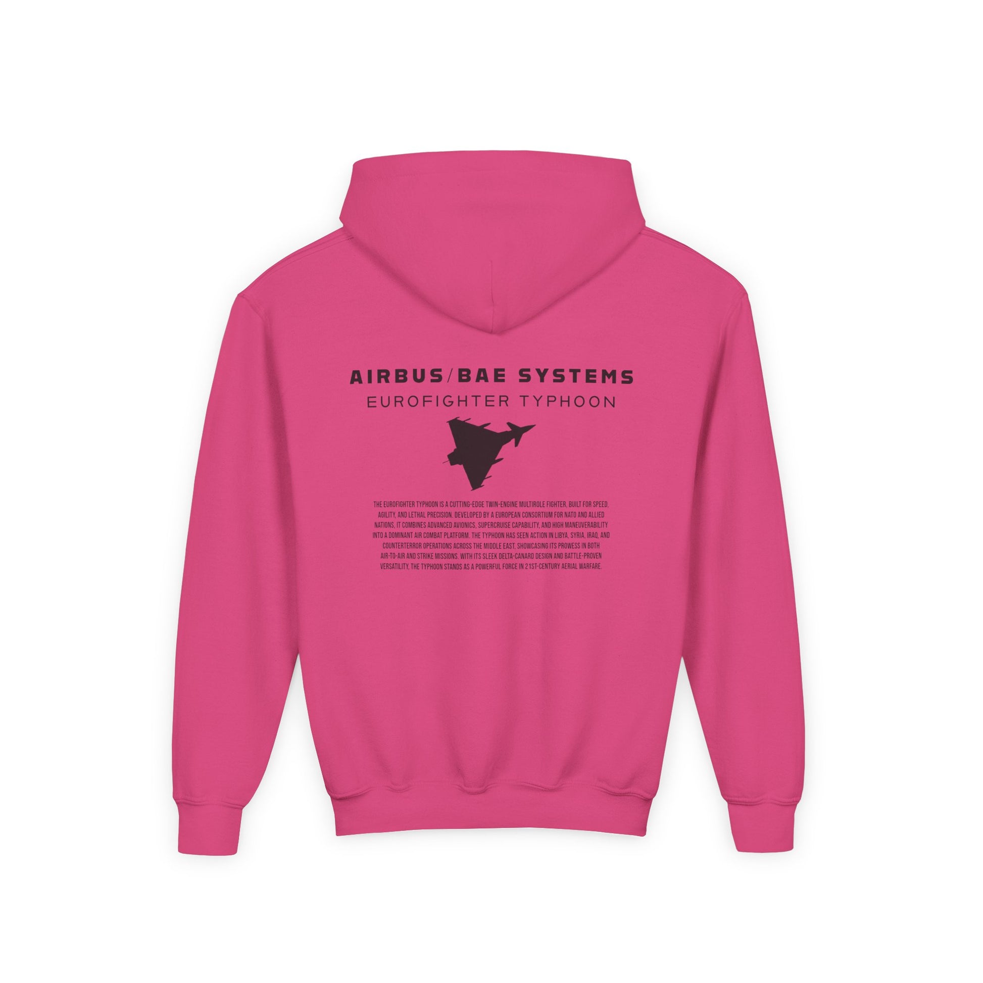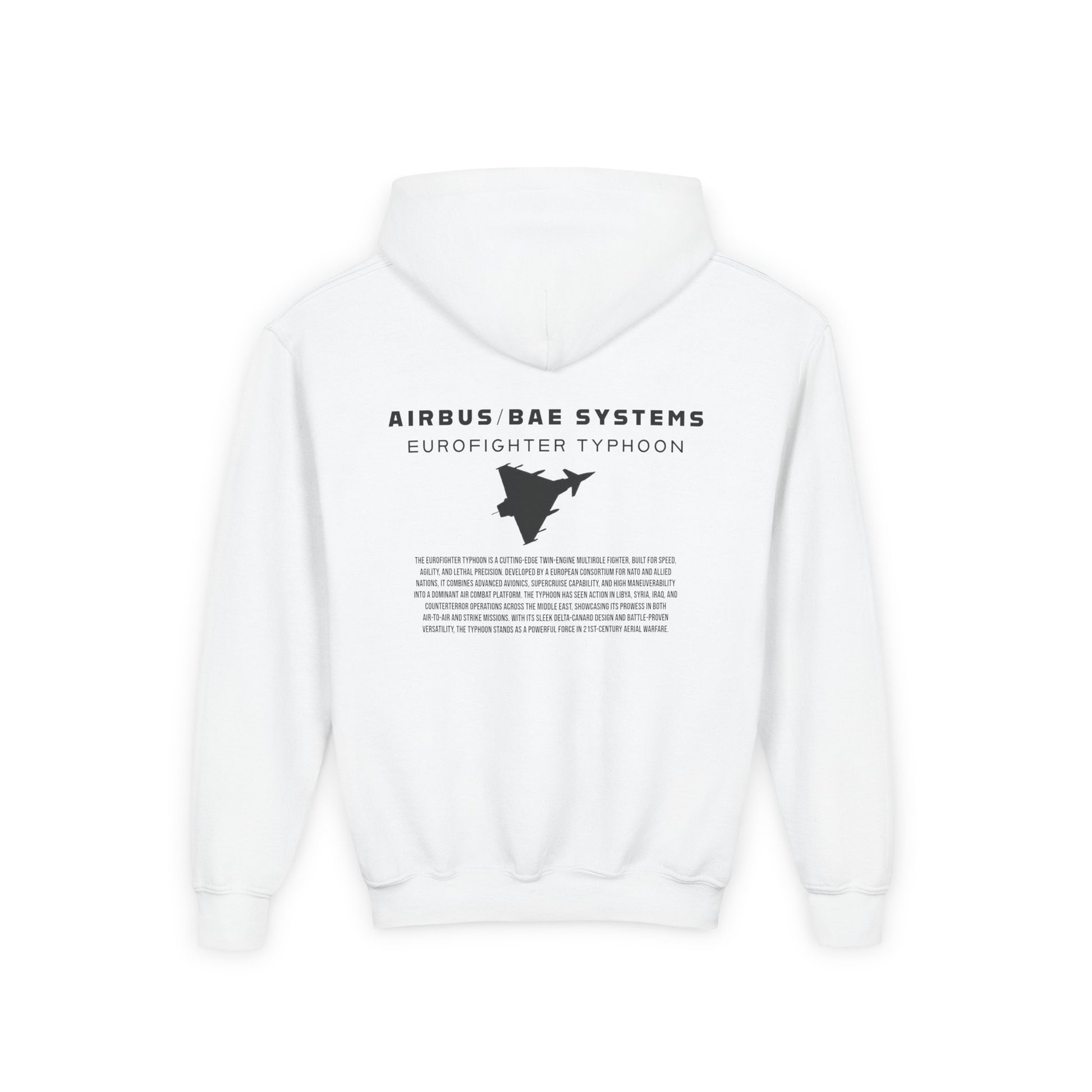 A beautiful and stylish hoodie in youth sizing featuring a Typhoon jet silhouette in the back, a Luftwaffe aircraft code artfully crafted in the corner of the front, and a brief description of one of Europe's finest jets.
