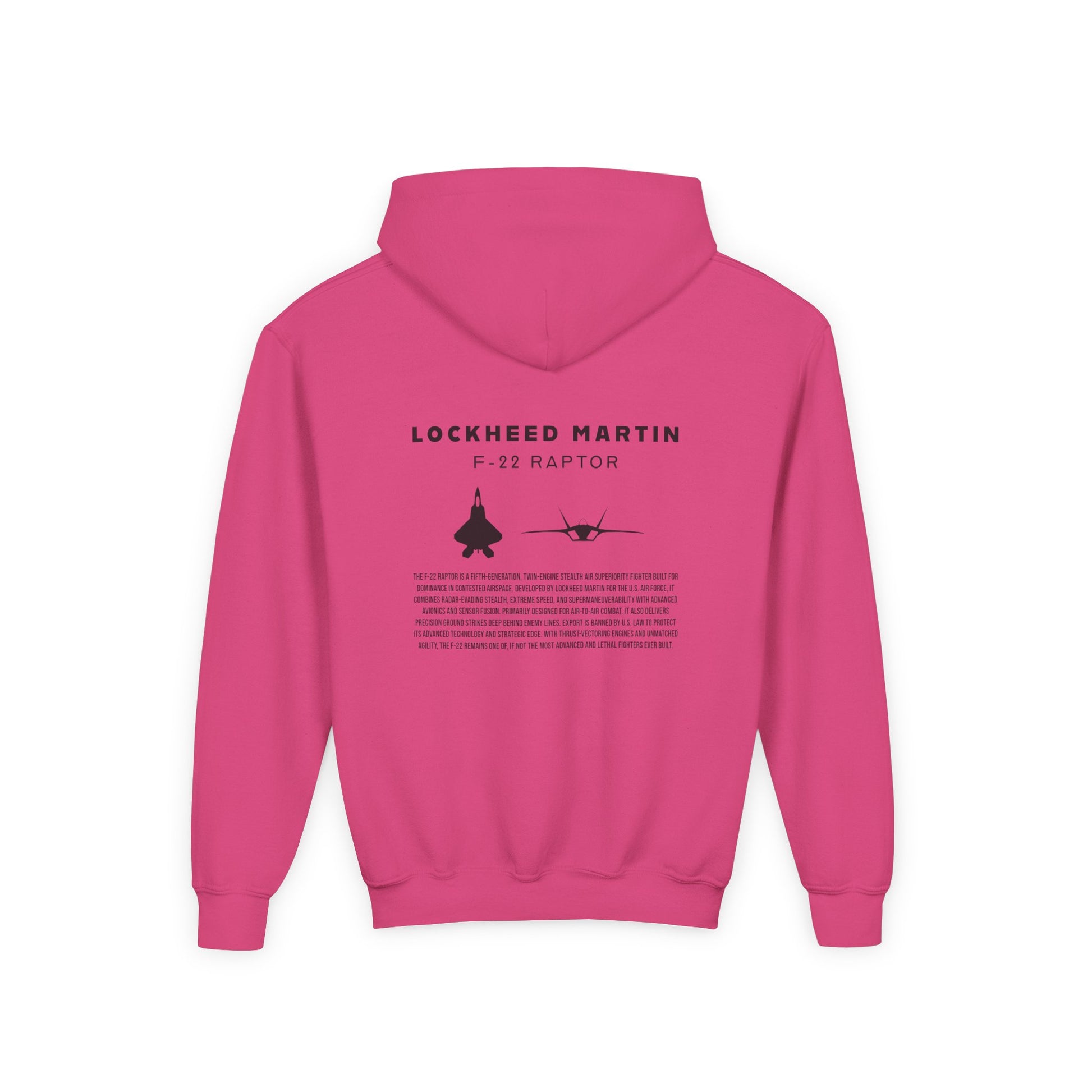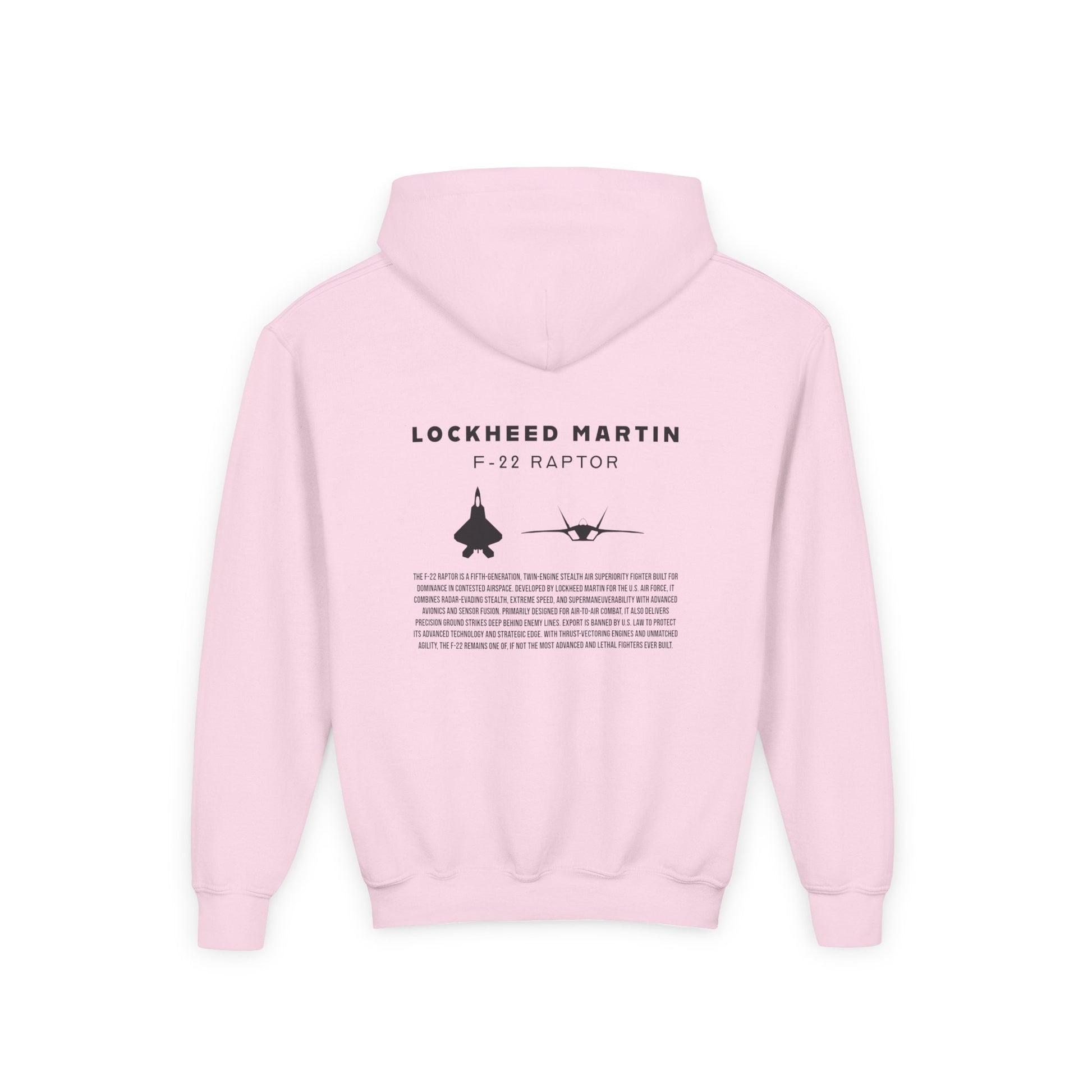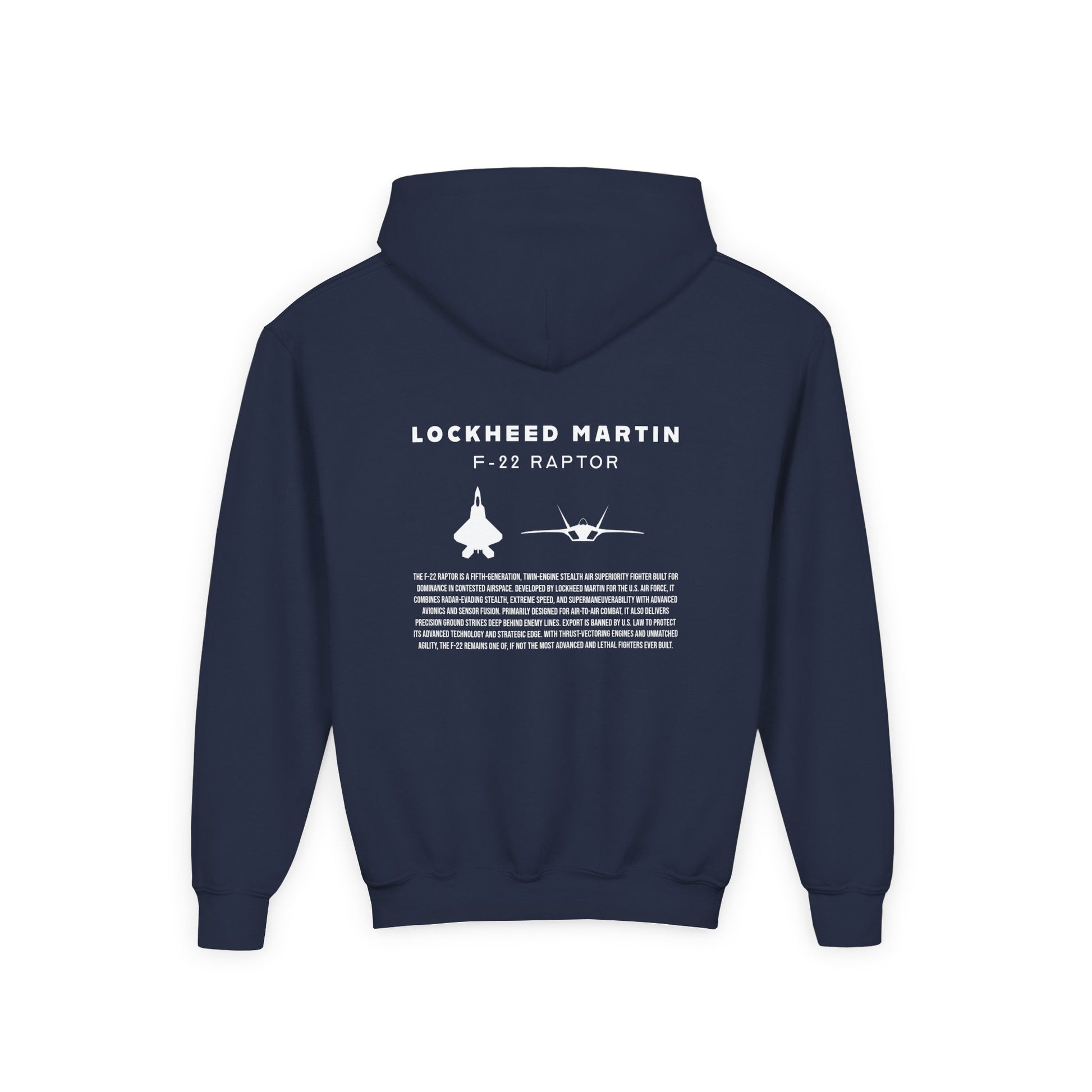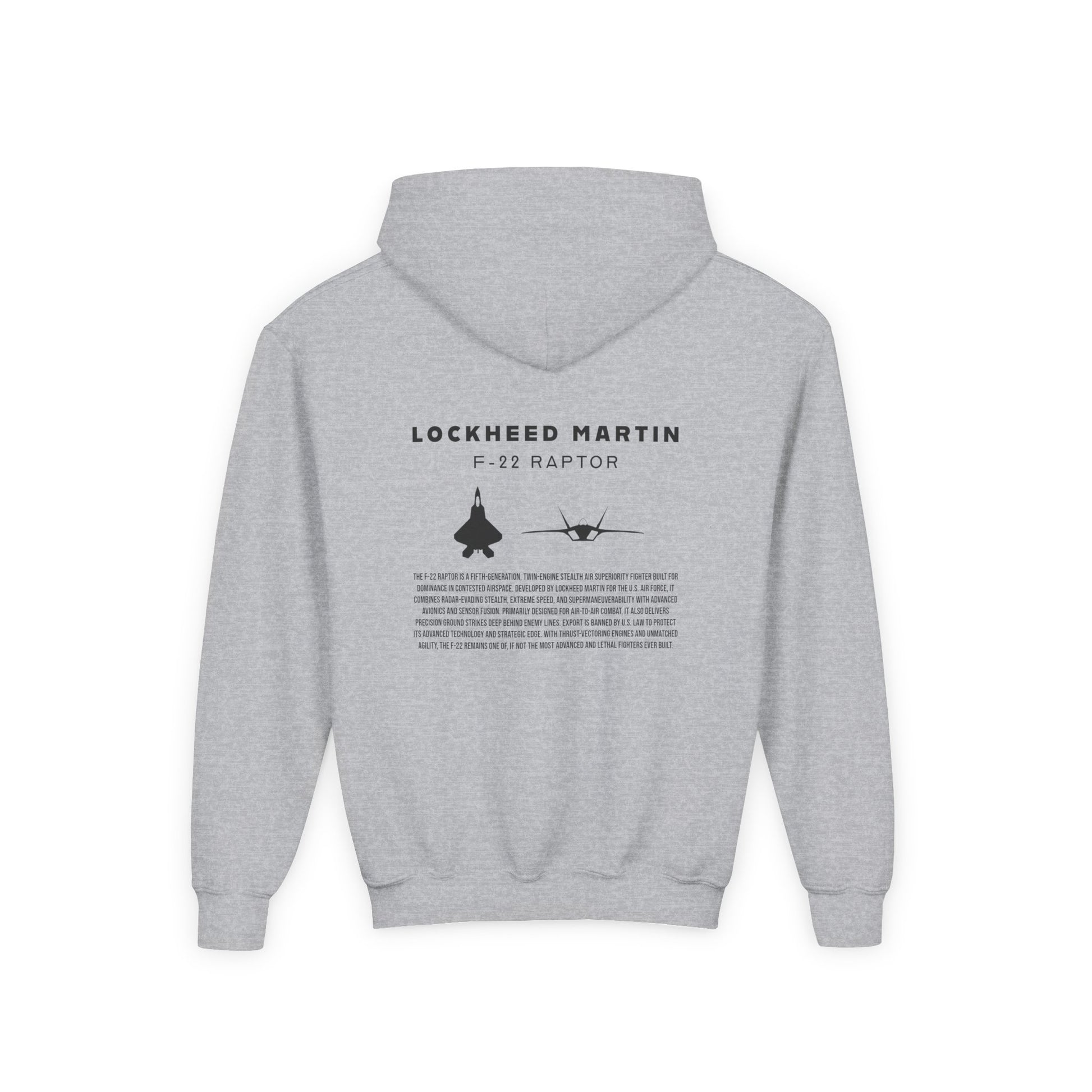 A beautiful and stylish hoodie in youth sizing featuring a F-22 Raptor jet silhouette, the tail logo of an Alaskan F-22 in the front, and a brief description of one of what is considered to be the greatest fighter jet of all time.