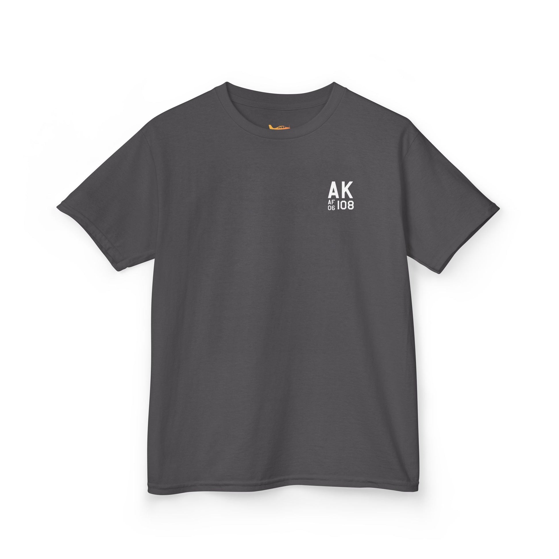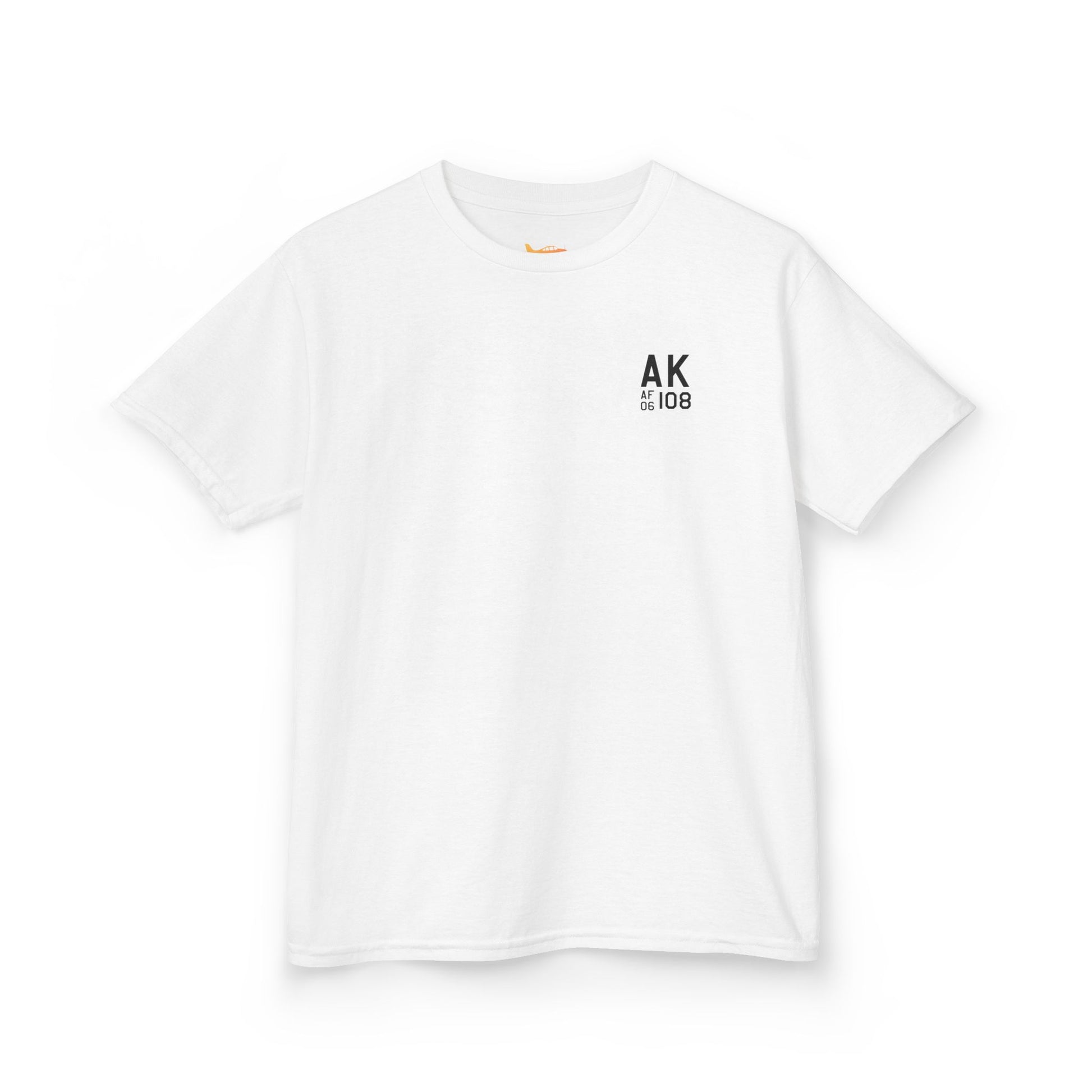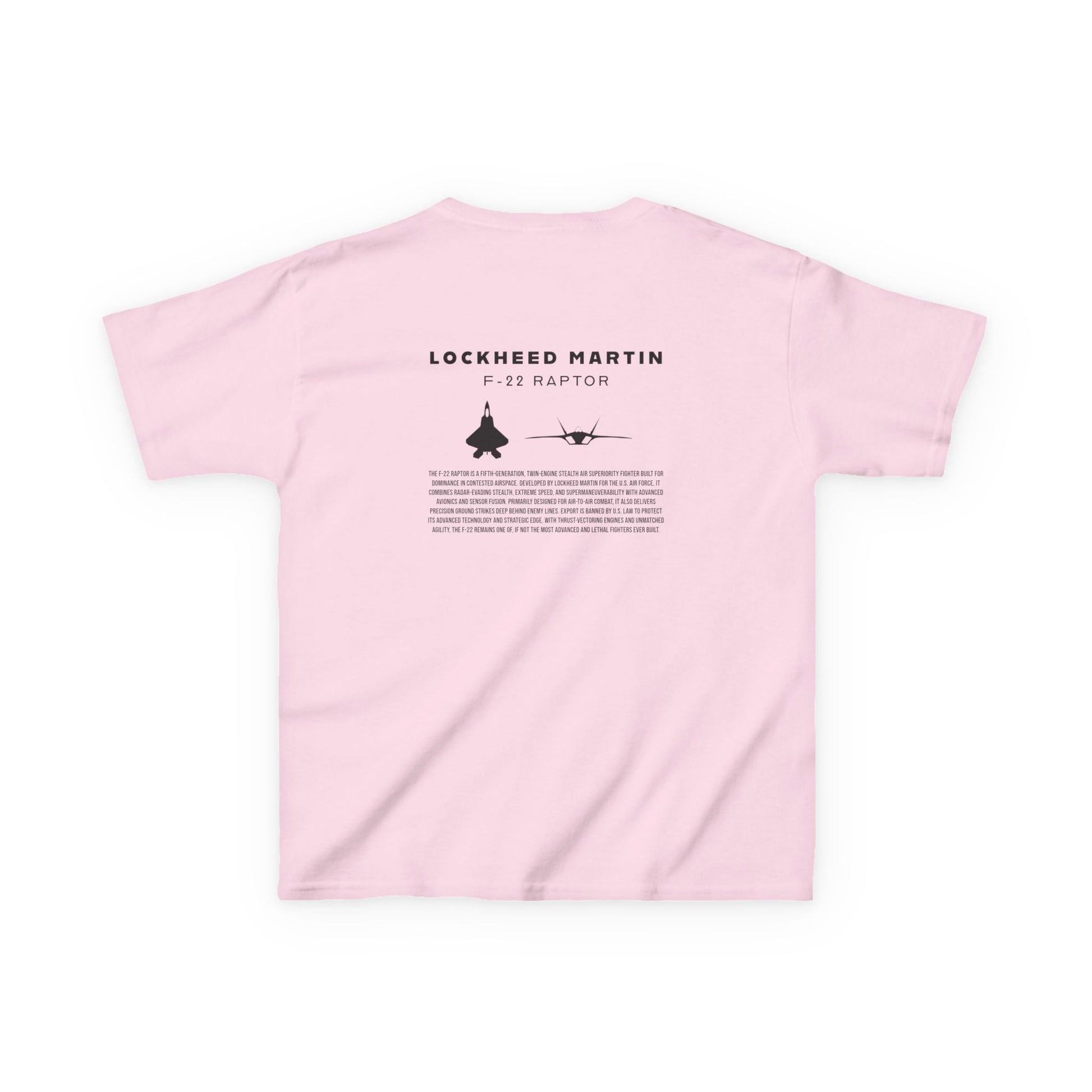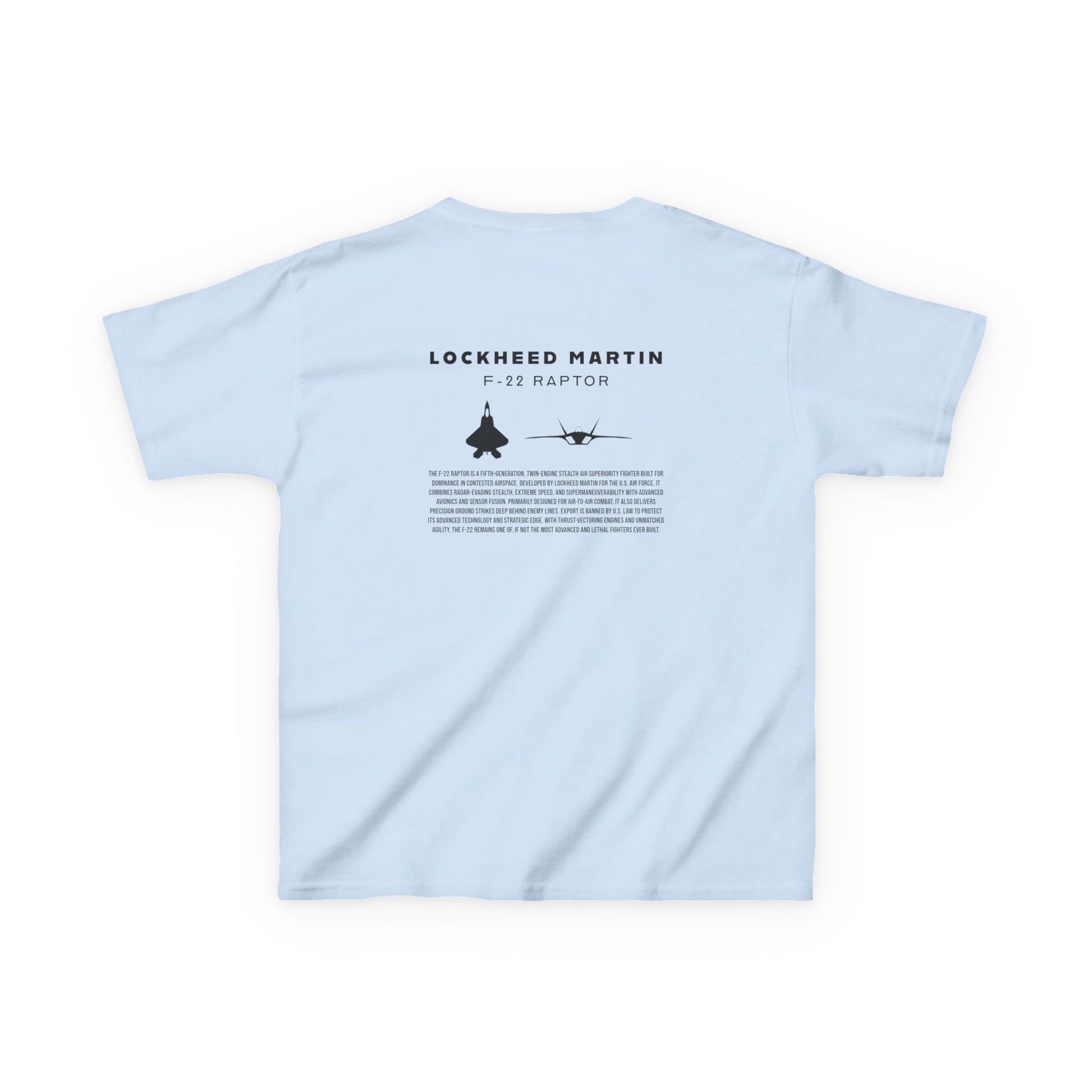 A beautiful and stylish t-shirt in youth sizing featuring a F-22 Raptor jet silhouette, the tail logo of an Alaskan F-22 in the front, and a brief description of one of what is considered to be the greatest fighter jet of all time.